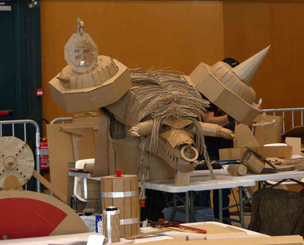 Et du côté de la cartonnade, ça commençait tout juste à prendre forme. Pour rappel, le principe est de construire des armes/armures et autres accessoires en carton, et le dimanche, c’est baston générale ! J’aime beaucoup le principe. Le problème est qu’il faut construire. Je préfère la phase de destruction…