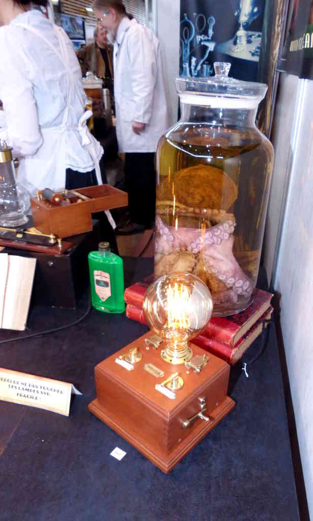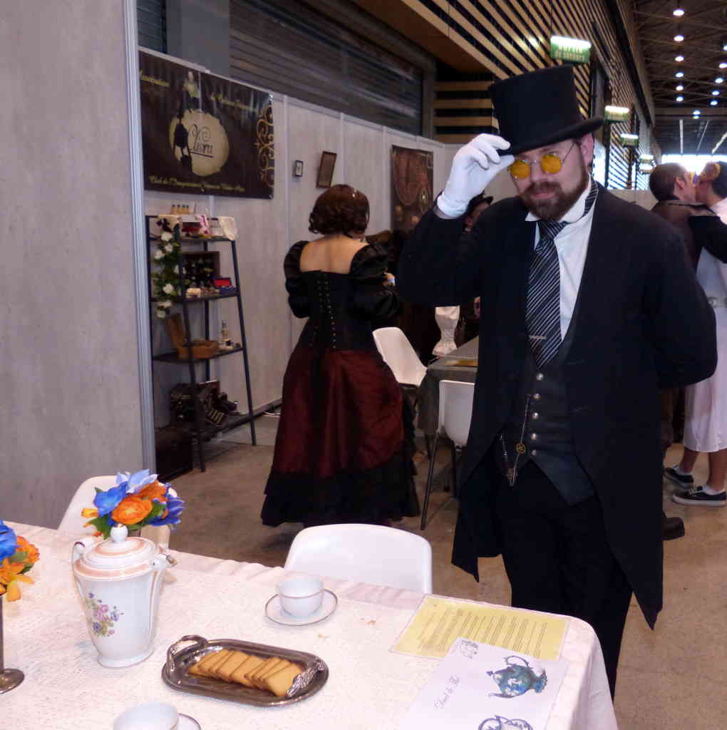 Le côté steampunk était plus développé grâce à l’association steampunk CLIVRA. Ils avaient de superbes costumes et ils proposaient plusieurs animations. J’ai défié mon désigné-volontaire compagnon de salon au Défi du thé. Et nous avons perdu tous les deux, mais nous avons pu déguster un thé et un petit Lu. Le principe du défi était simple : sous les ordres d’un majordome, il faut tremper son petit gâteau dans le thé et celui qui mange son gâteau en dernier sans l’avoir cassé remporte le défi. Le biscuit de mon infortuné compagnon s’est cassé en premier et malheureusement le mien s’est cassé quand j’ai essayé de le manger. Donc nous avons tous les deux perdus, mais notez bien qu’il a perdu en premier…