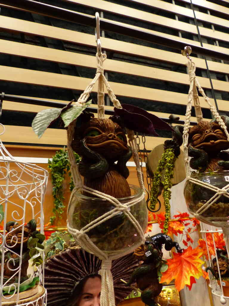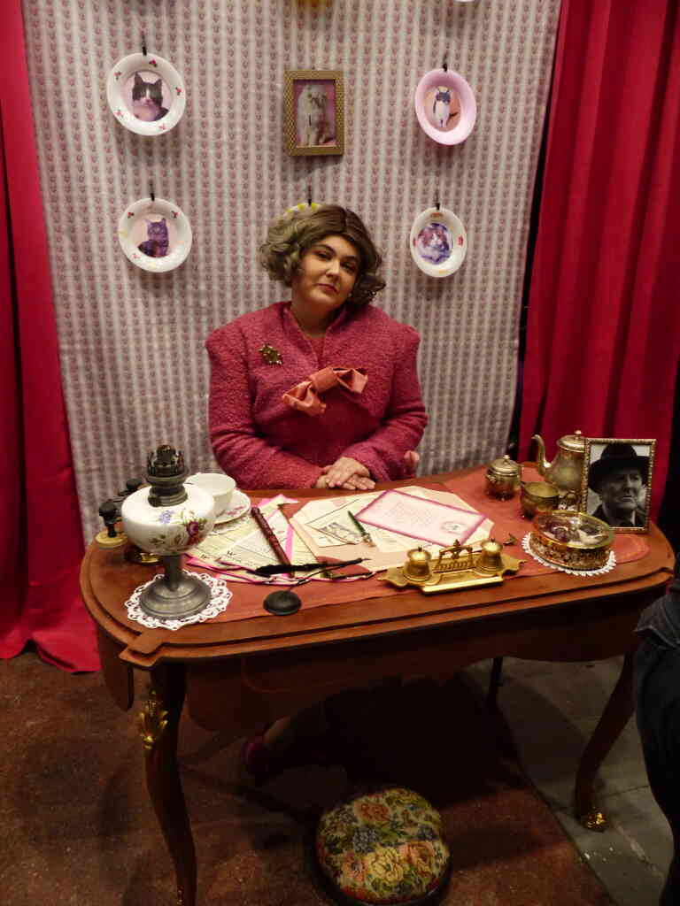 On a commencé directement avec le monde magique de King Cross ou le monde des Sorciers. Il y a eu des stands de baguettes magiques, des potions contenant des dés, parfaits pour vos parties de donjons et dragons. Ou bien la florissante boutique de mandragores Les Mandy’s dont les mandragores me faisaient de l’œil ! Avec Tadam, nous avons même fini par y revenir pour en adopter une chacun. La mienne me regarde maintenant jouer sur mon PC. Lucius Malfoy distribuait des quêtes, sûrement un recrutement déguisé des mangemorts. Dolores Umbrige était présente avec son fabuleux (horrible) décor rose. Rita Skeeter semblait chercher un sujet d’article en la personne de Gilderoy Lockhart. Et encore pleins d’autres qui étaient présents pour notre bon plaisir des yeux (ou pas).