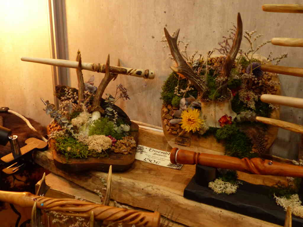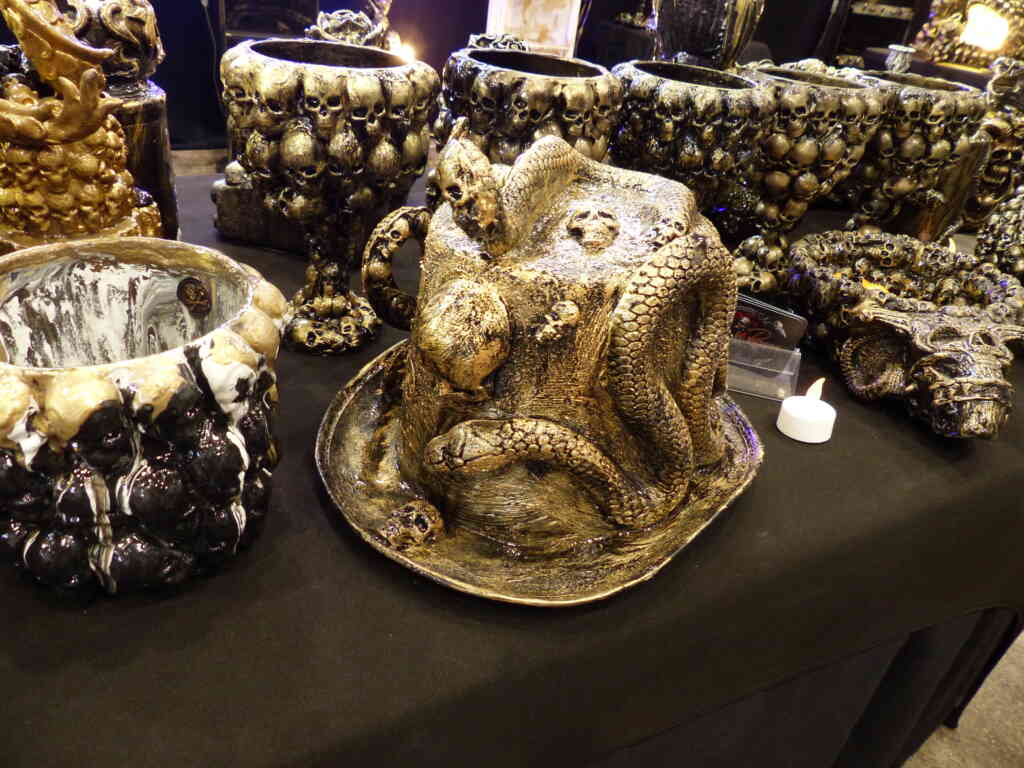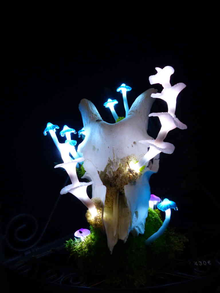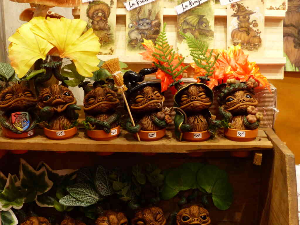 Je dois avouer que quand nous sommes passés à cette partie, nous commencions à saturer. Il y avait beaucoup de monde et la disposition des stands permettait d’avoir un côté plus immersif, mais aussi plus restreint et donc plus bondé par endroits. Un véritable cauchemar qui me faisait développer une agoraphobie ! Le monde fantastique fut très amusant à visiter. Nous avons ris avec le stand si particulier « des breuvages de la chaudasse » mais aussi avec la rencontre d’une Orc particulière (je me suis fait draguer au passage !) qui nous a laissé sa marque de rouge à lèvres sur nos joues respectives. Il a été amusant de chercher les gens dans le festival qui ont reçu la marque d’affection de cette charmante personne. Et elle a embrassé beaucoup de monde ! Les stands regorgeaient d’articles pour avoir la parfaite tenue de l’être fantastique que vous souhaitez, que cela soit loup, dragon, elfe, etc. Nous avons aussi effectué notre traditionnel tour dans la boutique Lumycelium avec ses superbes petits champignons lumineux.