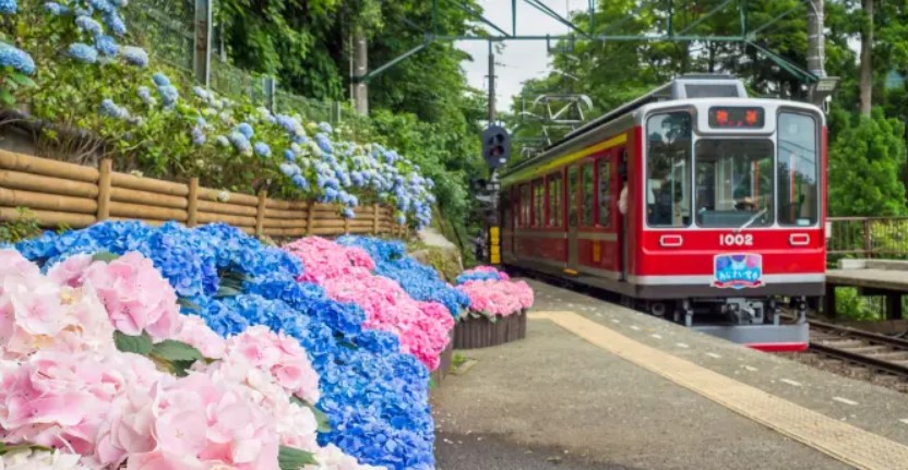 On poursuit notre tour des trains japonais avec la ligne Hakone Tozan qui propose un petit train rouge et une vue superbe sur des hortensias.