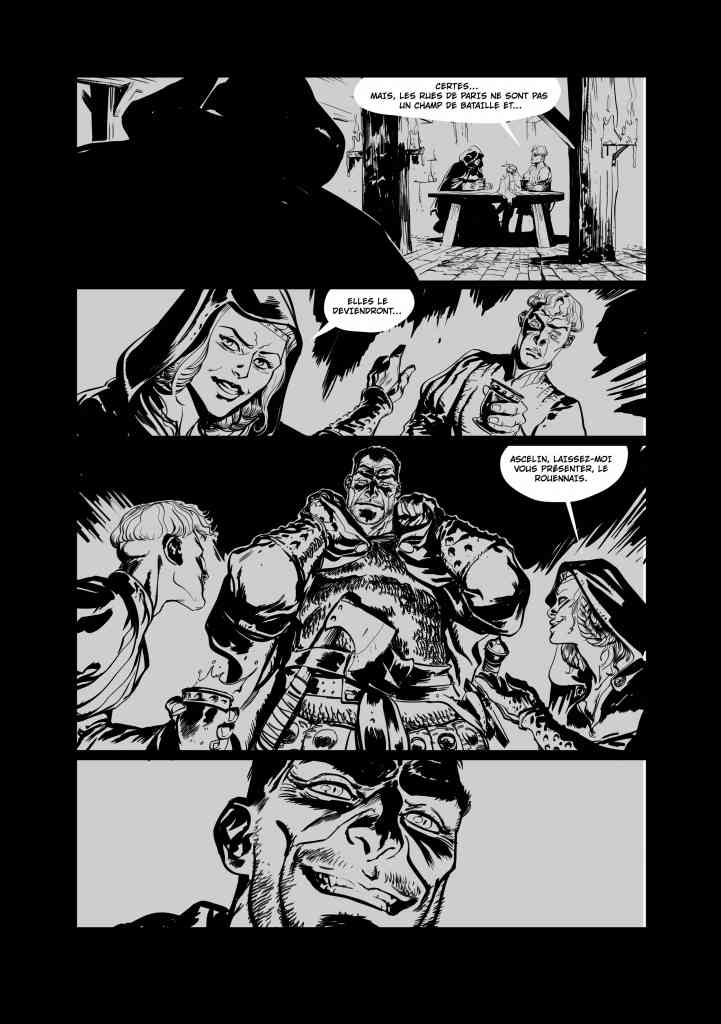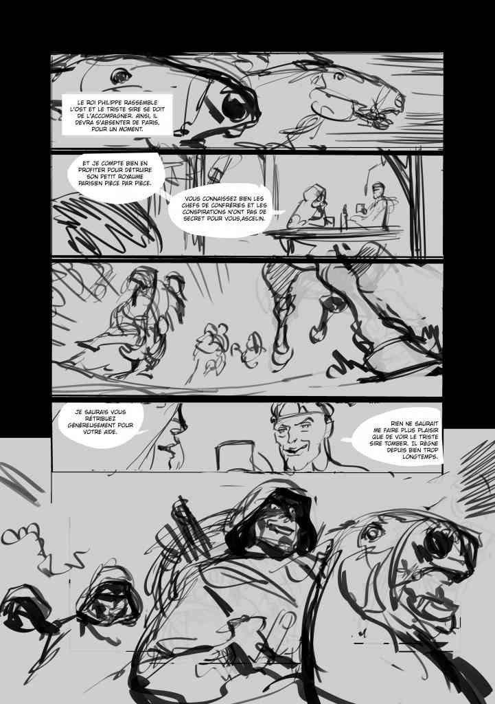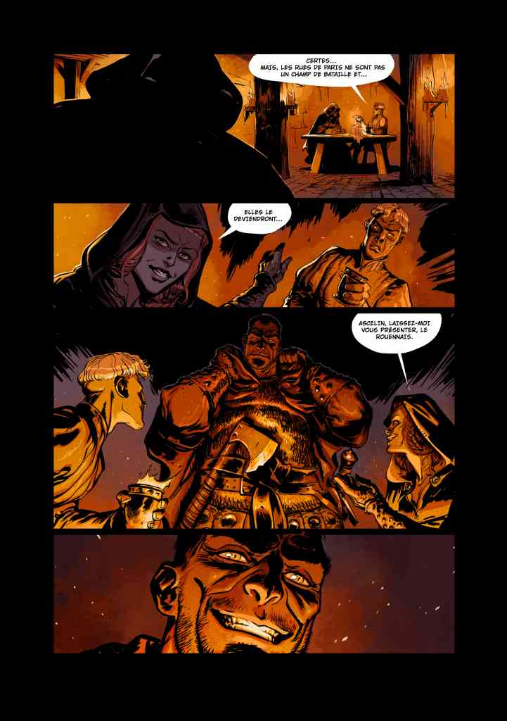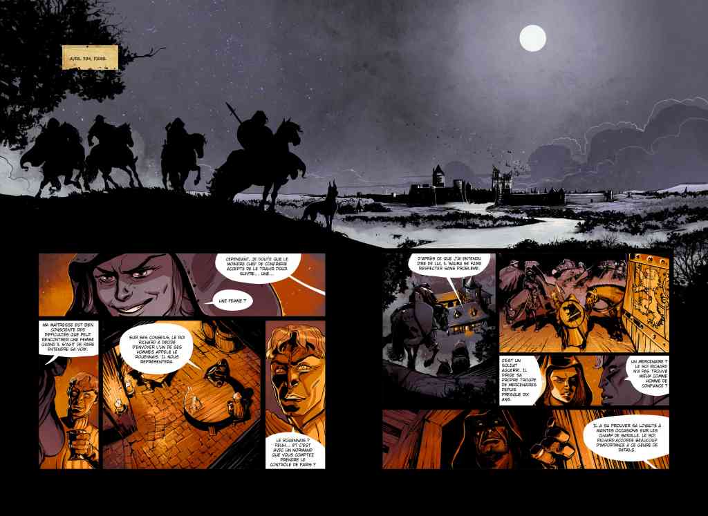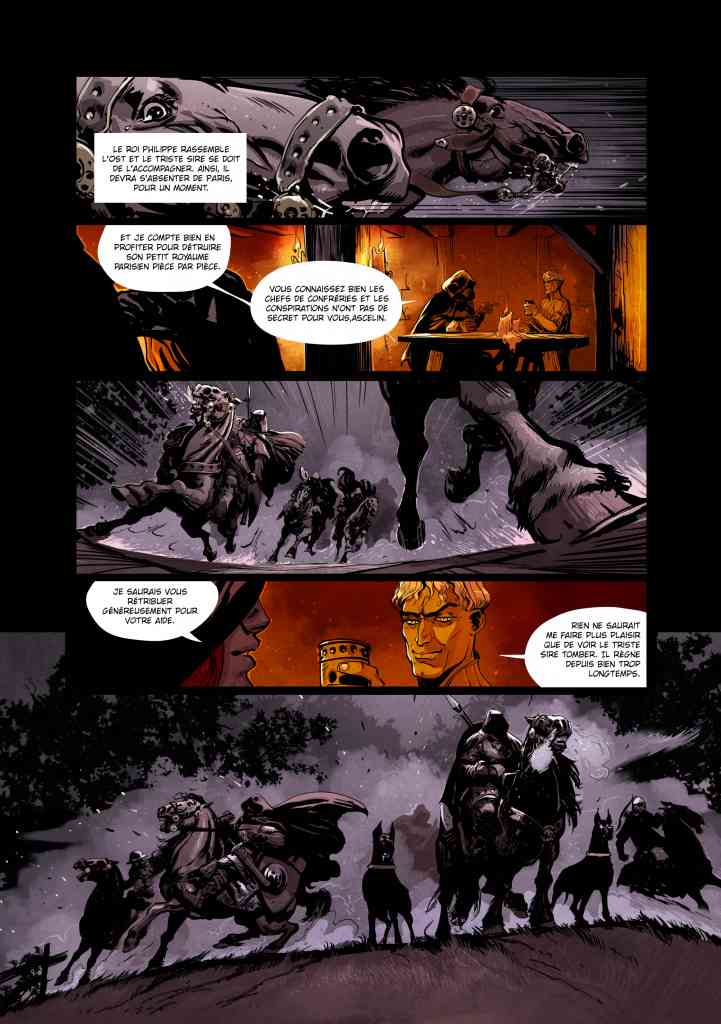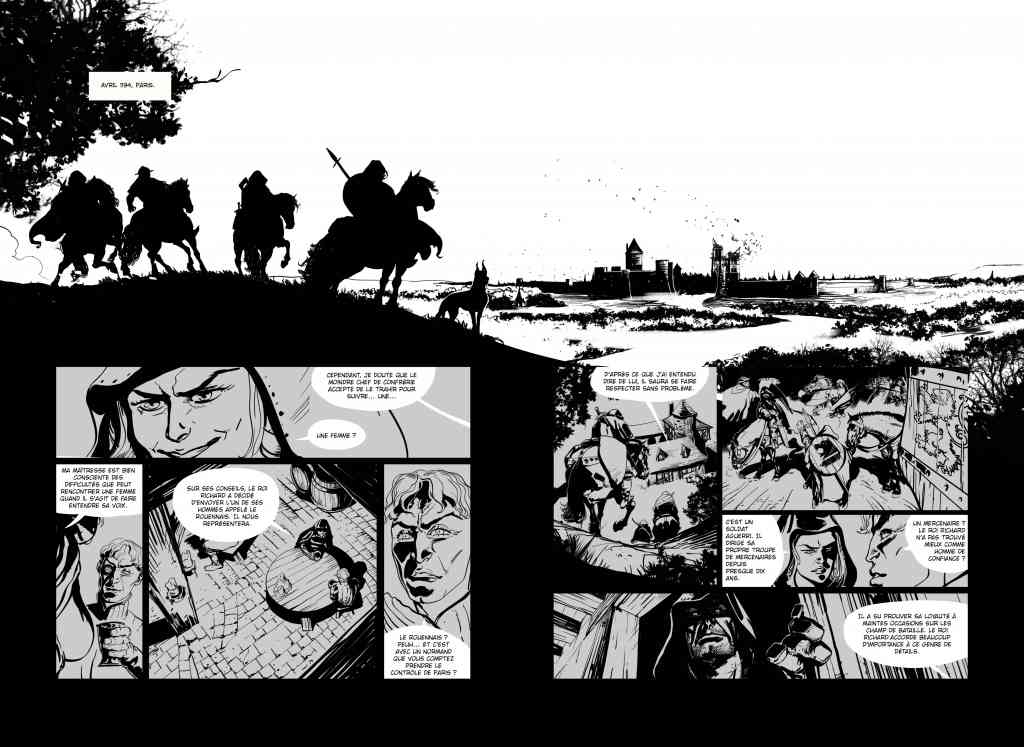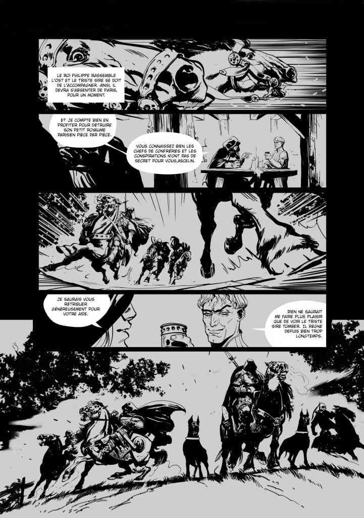Quand on a fixé la période, celle de Philippe Auguste, je me suis tout de suite plongé dans la doc et j’ai revu Kingdom of heaven (ainsi que Game of throne pour l’ambiance), ensuite on voulait faire du thriller, et là je savais aussi que je voulais un encrage puissant à l’américaine, avec une couleur en aplat venant souligner l’encrage. Quelques tests plus tard, l’ambiance était posée.