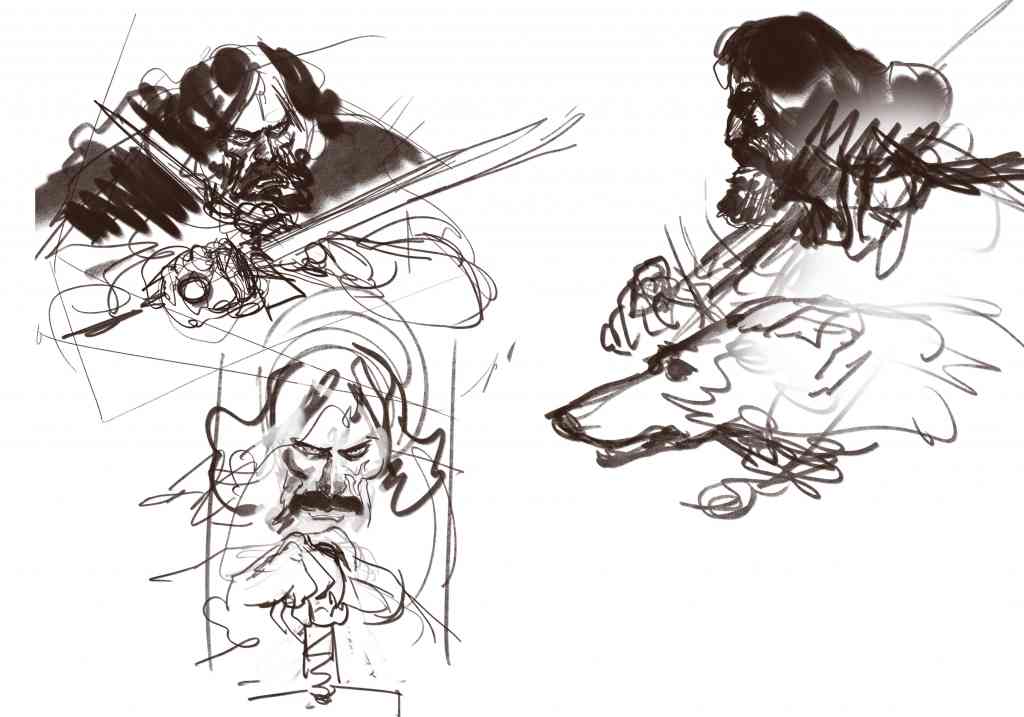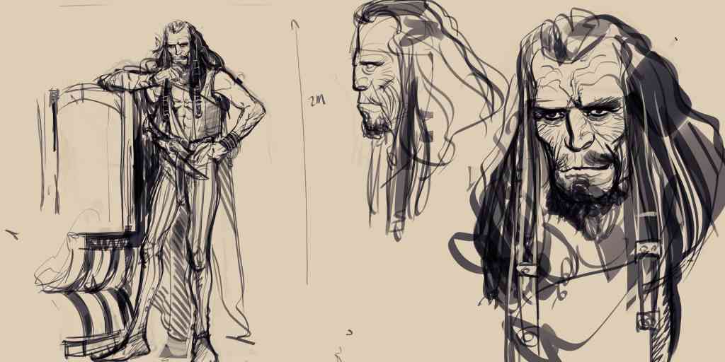 Pas mal de recherches ont été nécessaires avant de le fixer. Son allure globale vient d’une idée de Vincent qui le voulait pas forcément beau. Il m’a orienté vers un acteur jouant dans la série Ripper Street, Joseph Mawle. Et je l’ai adapté à ma sauce pour s’orienter vers ce personnage austère, noir. Mais la difficulté était aussi de le montrer capable de bonté, et de chaleur paternelle…..