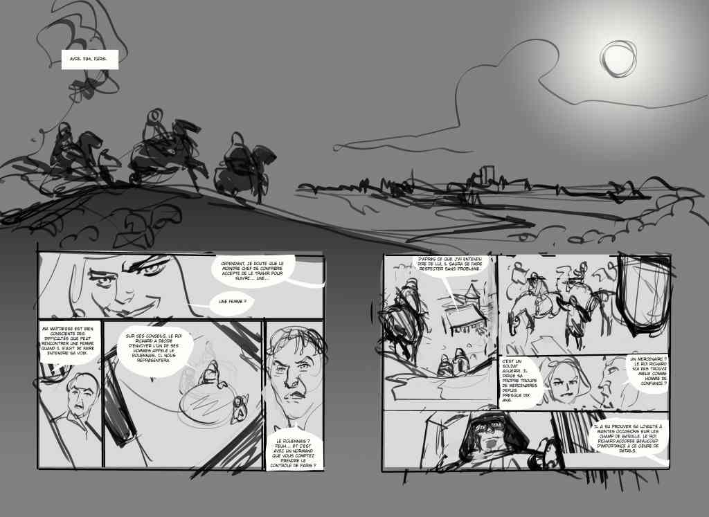 Quand on a fixé la période, celle de Philippe Auguste, je me suis tout de suite plongé dans la doc et j’ai revu Kingdom of heaven (ainsi que Game of throne pour l’ambiance), ensuite on voulait faire du thriller, et là je savais aussi que je voulais un encrage puissant à l’américaine, avec une couleur en aplat venant souligner l’encrage. Quelques tests plus tard, l’ambiance était posée.