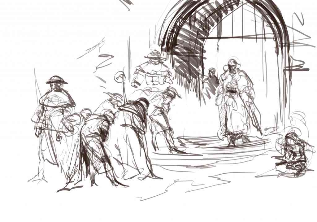 On savait aussi qu’on voulait un Paris quelque peu fantasmé, avec ses gangs et ses dessous cachés. La cour des miracles était le choix parfait. En ce qui nous concerne c’est une sorte de proto-cours des miracles recueillant tous les malformés, les rejetés du monde du dessus…. une société sous la société… gérée par un roi, le Grand coesre. Un personnage puissant dont le poids peut faire pencher la balance dans une lutte de pouvoir. Il était plus qu’intéressant de lier le Grand coesre à Tristan. C’est le monde de Tristan à l’origine. Celui d’où il vient et qu’il rejette. Ça on le saura plus tard… Pour ce monde du dessous, je voulais donc une société sous la société… quelque chose de fou, vivant hors des règles royales et religieuses… un monde où tout est possible pour ces mal aimés…. un environnement de catacombes et de restes de Lutèce était tout adapté… On est dans le royaume des morts, ou pourtant la vie déborde.
