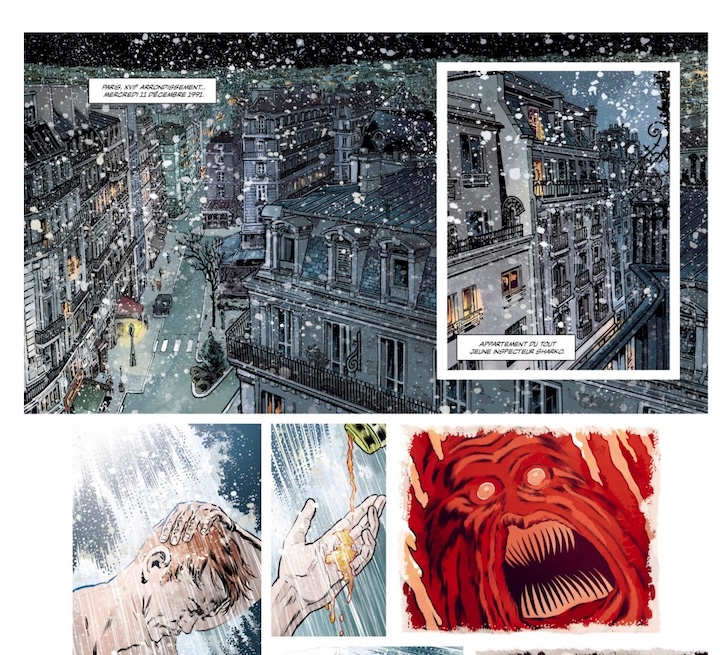 Franck Sharko n’est qu’un jeunot dans la police du 36 quai des orfèvres. Il est chez lui, sous la douche, et des salves d’images effrayantes s’imposent à lui. Heureusement une personne vient frapper à la porte ce qui lui permet de sortir de ces pensées sombres. C’est sa compagne qui lui a fait la surprise de débarquer à l’improviste mais même cette présence ne lui fait pas oublier ce qu’il a vécu la veille. Il a été dépêché sur une scène de crime particulièrement glauque. Le voilà donc qui débarque, avec son coéquipier, dans un atelier de peinture parsemé d’oeuvres représentant une tête de monstre aux dents acérées. Pire encore, dans une chambre, il découvre un corps attaché au lit avec un sac craft sur la tête et il peut dire merci à ce sac car la tête du cadavre est complètement décomposée. Au-dessus de la tête de lit, des photos sont alignées, elle représentent des enfants pris individuellement en photo et sans le moindre habit sur eux. Dure affaire pour ce jeune policier…