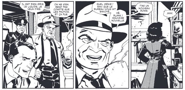 Cela commence par une chambre, en pleine nuit. Nous sommes en 1949. Son occupante dort paisiblement quand, subitement, le téléphone se met à sonner. Ce qui est troublant c’est que cette première planche nous propose aussi des vignettes en dehors de cette chambre, elles nous montrent une autre femme, cyborg probablement, qui évolue dans un monde futuriste inconnu. Et d’un coup les auteurs nous ramènent en 1949 et la femme qui dormait répond au téléphone. Elle s’appelle Blank et elle est u agent spécial. Au téléphone, une personne lui indique qu’il y a eu un autre meurtre, sans plus de précisions. Arrivée sur les lieux de l’homicide, elle ne peut que constater le massacre : le corps est atrocement mutilé. Elle connaît le tueur et ses habitudes mais là, le modus operandi a légèrement changé car le meurtre a eu lieu chez la victime ce qui n’est pas l’habitude du meurtrier présumé. Elle est impressionnante de facilité dans son analyse de la scène de crime.
