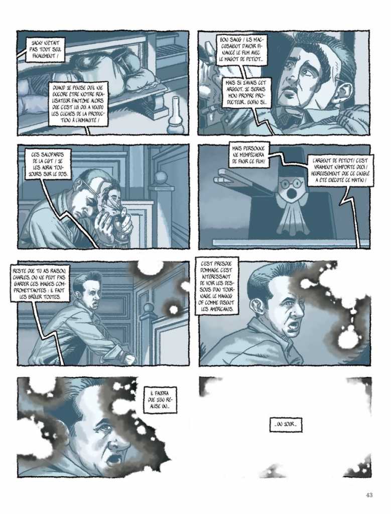 Je leur ai donc envoyés des découpages dialogués case à case. Ils ont trouvé des solutions graphiques pour chaque niveau de la mise en abyme. Le style semi-réaliste de Griffo correspond bien à la truculence du début du XIXème siècle ainsi qu’à la folie qui monte chez son romancier. De même, le trait plus sombre, plus dense de Loïc est tout à l’image du caractère tyrannique de Clouzot et de la dureté de l’après-seconde guerre mondiale.