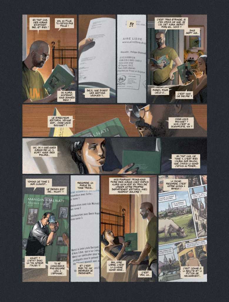 J’ai entièrement pensé les scénarios en fonction de la mise en abyme: elle devait être le sujet en même temps que la forme des albums. C’était très contraignant donc très stimulant pour un scénariste… enfin plutôt deux car Denis a co-scénarisé le dernier album avec moi, celui qui parle de nous.