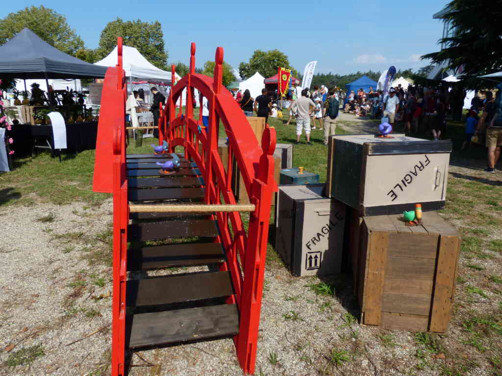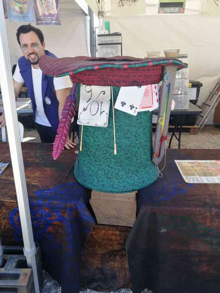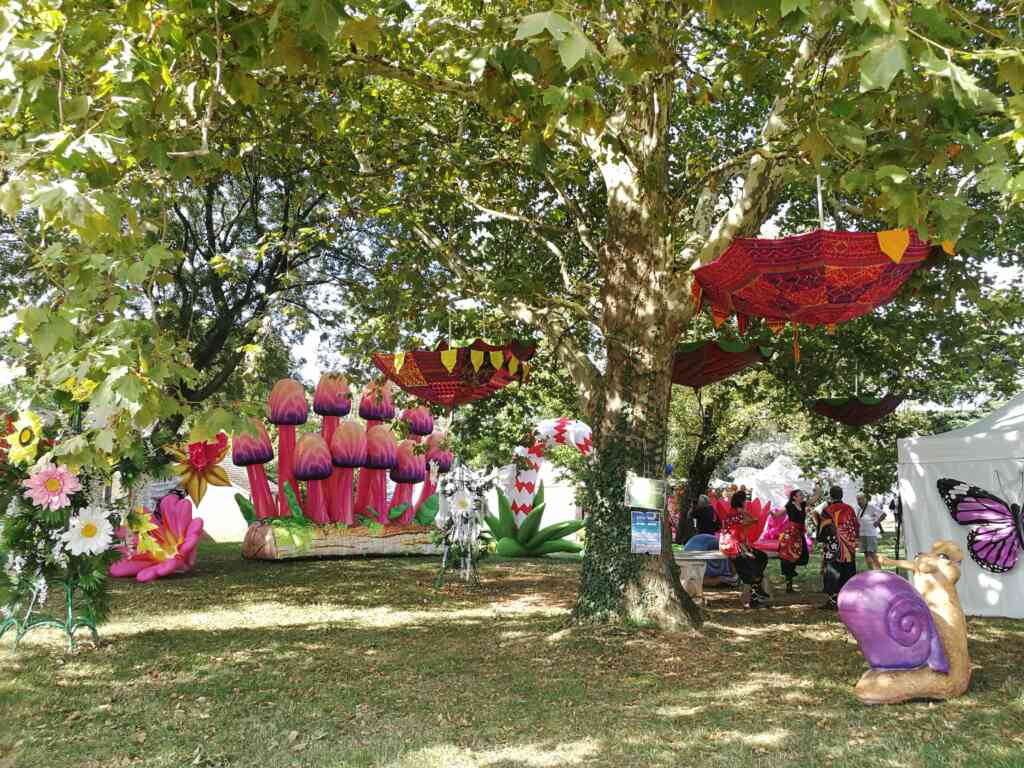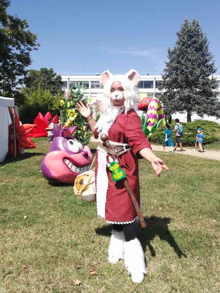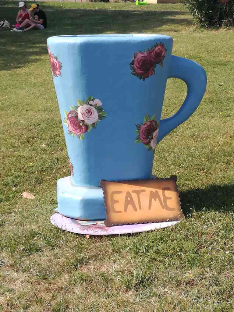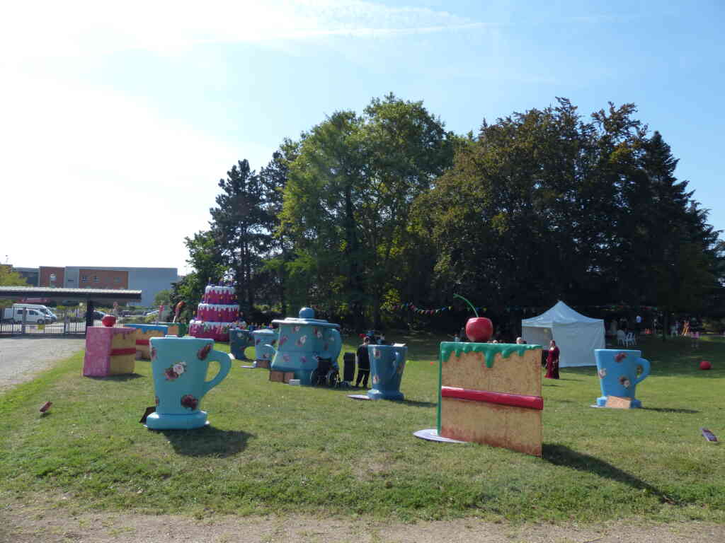 Le festival Yggdrasil « La fête du Chapelier » Nouvelle édition de la Fête du Chapelier, qui est comme la petite sœur du Festival Yggdrasil mais en plus axé sur le thème fantasy et particulièrement celui de « Alice au pays Merveilles ». Ce festival est différent car il se trouve en extérieur ! C’est donc une sortie parfaite pour profiter du beau temps. On pourrait donc penser que cela rend la décoration difficile mais les équipes magiques de Yggdrasil savent être capable d’ingéniosités. On le ressent sur la présence de drapeaux, des structures gonflables donnant l’impression d’une forêt étrange. Un gâteau gigantesque pour notre non-anniversaire (j’espère que vous avez lu le conte sinon, difficile à suivre !). Tout a été pensé pour créer des petites zones d’immersion avec des personnages spécifiques, la forêt Mystique du Cheshire, le camp d’entrainement de la Reine de Cœur, la grande Table des Tweedles, etc…. Le détail est poussé jusqu’à attribuer une zone à certaines activités, comme « au Table » qui est la partie restauration. Rien n’est laissé au hasard et tout est bien créé pour amener un univers enchanteur. C’est d’ailleurs poussé jusqu’à la présence d’acteurs qui passent de zones en zones et qui incarnent les personnages de l’histoire. Il est donc tout à fait possible de croiser le sourire malicieux du Chat de Cheshire qui va poser des questions folles pour vérifier votre folie.