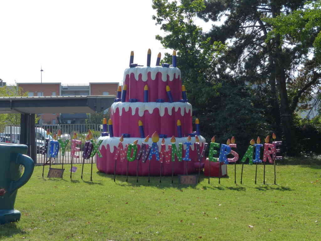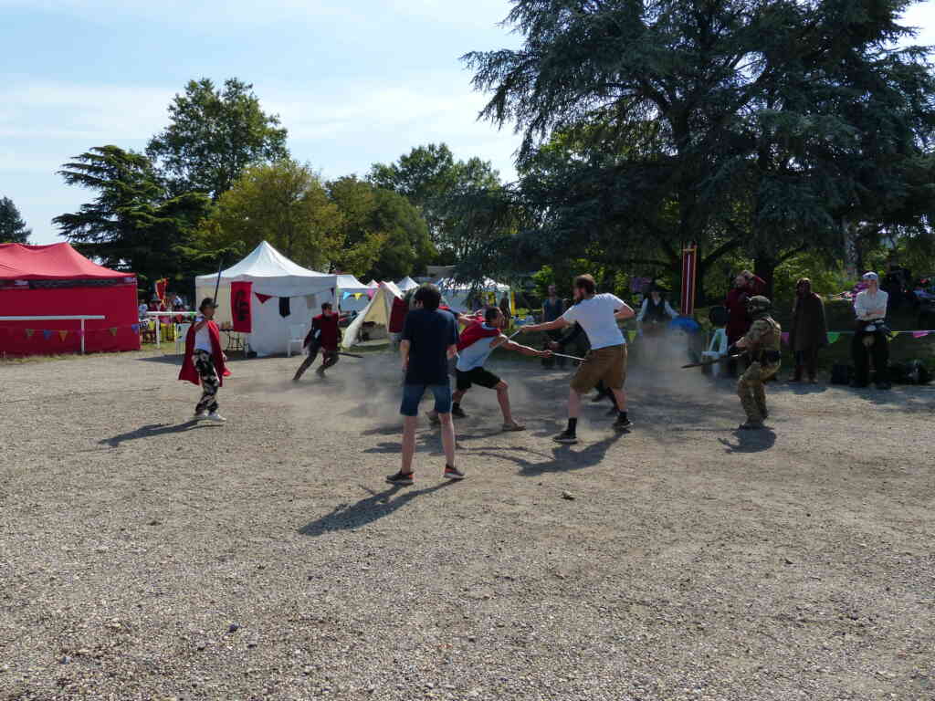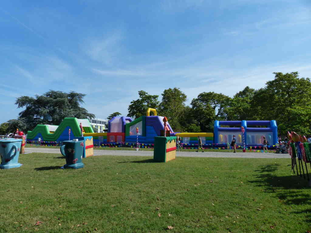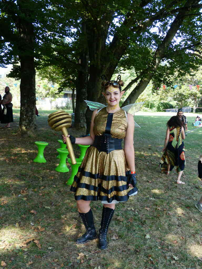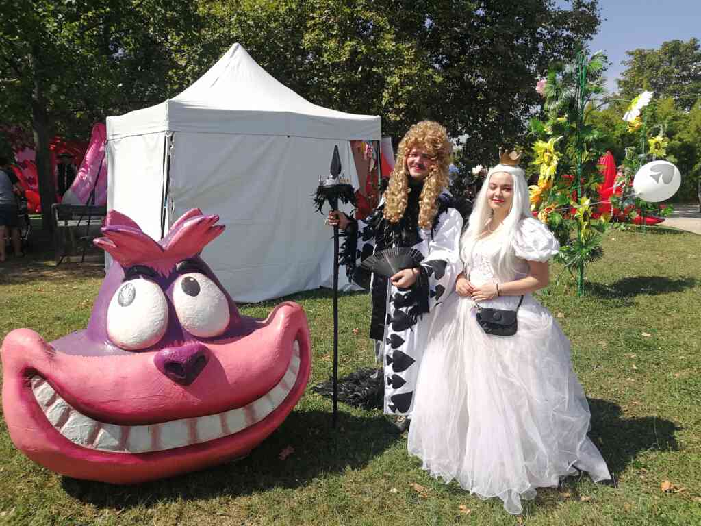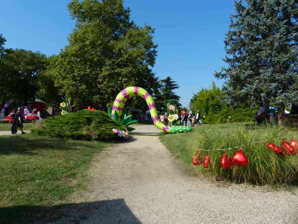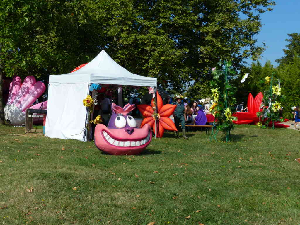 Le festival Yggdrasil « La fête du Chapelier » Nouvelle édition de la Fête du Chapelier, qui est comme la petite sœur du Festival Yggdrasil mais en plus axé sur le thème fantasy et particulièrement celui de « Alice au pays Merveilles ». Ce festival est différent car il se trouve en extérieur ! C’est donc une sortie parfaite pour profiter du beau temps. On pourrait donc penser que cela rend la décoration difficile mais les équipes magiques de Yggdrasil savent être capable d’ingéniosités. On le ressent sur la présence de drapeaux, des structures gonflables donnant l’impression d’une forêt étrange. Un gâteau gigantesque pour notre non-anniversaire (j’espère que vous avez lu le conte sinon, difficile à suivre !). Tout a été pensé pour créer des petites zones d’immersion avec des personnages spécifiques, la forêt Mystique du Cheshire, le camp d’entrainement de la Reine de Cœur, la grande Table des Tweedles, etc…. Le détail est poussé jusqu’à attribuer une zone à certaines activités, comme « au Table » qui est la partie restauration. Rien n’est laissé au hasard et tout est bien créé pour amener un univers enchanteur. C’est d’ailleurs poussé jusqu’à la présence d’acteurs qui passent de zones en zones et qui incarnent les personnages de l’histoire. Il est donc tout à fait possible de croiser le sourire malicieux du Chat de Cheshire qui va poser des questions folles pour vérifier votre folie.