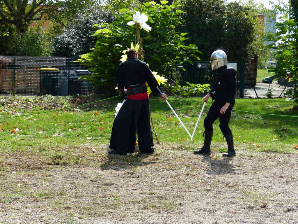 Toujours présents, les Bâtards d’Occitanie, l’Académie de sabre laser et le Haidong Gumdo. Les premiers avaient organisés un petit parcours du combattant bien sympathique pour petits et grands avec esquive de sacs en mouvement, ramper sous (ou sur, suivant la tenue) des fils et frappe sur un pauvre mannequin et son bouclier, le tout avec une tenue matelassée et un casque.