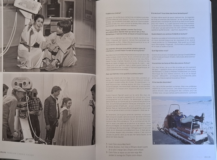 Allez c’est reparti pour une très belle revue orchestrée par Huginn & Munnin. Rappelez-vous, je vous ai déjà présenté le tome 1, le tome 2, le tome 3 & le tome 4. Ainsi nous avons le droit à un opus par an et je dois dire que l’attente est longue car c’est toujours réussi. On retrouve la composition habituelle : deux dossiers spécifiques et ensuite des rubriques un peu fourre-tout. On commence avec un magnifique dossier sur Leia et donc Carrie Fisher. On y aborde les différentes scènes de la princesse mais on a le droit aussi à une très belle interview de l’actrice. Très beau dossier qui ne manque pas d’éveiller la nostalgie. Ensuite, on a le droit à un voyage du côté du Japon. La revue a proposé à des artistes du pays du soleil levant de proposer des illustrations de l’univers de Lucas. Et là vous allez en prendre plein les mirettes, c’est magnifique !