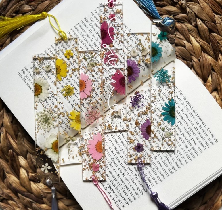 Le premier est composé de résine et de fleurs séchées. Vous pouvez choisir les couleurs et vous pouvez même indiquer un prénom ou pas.