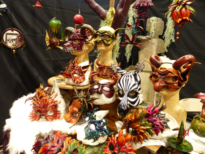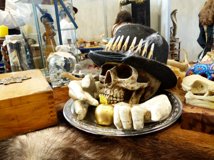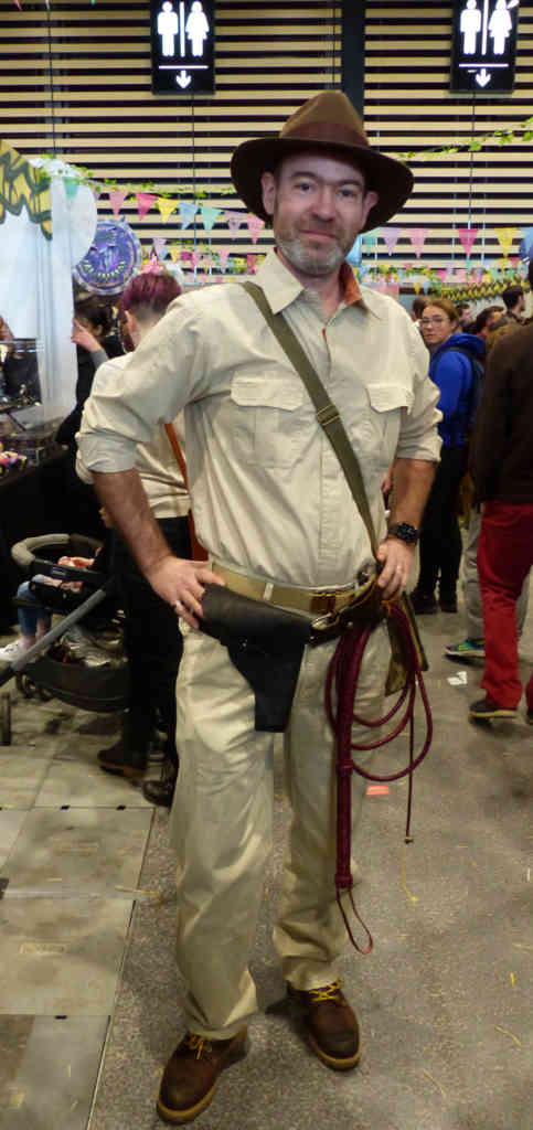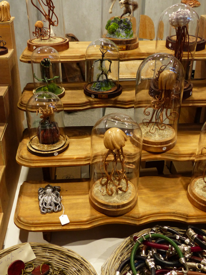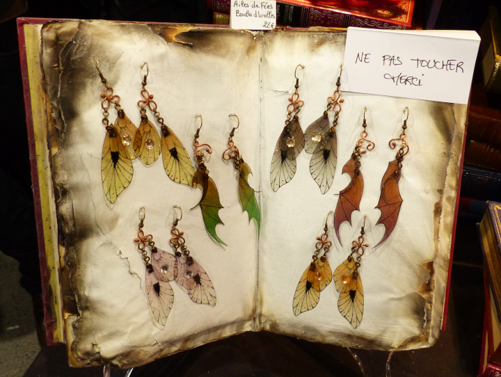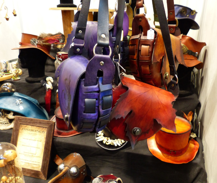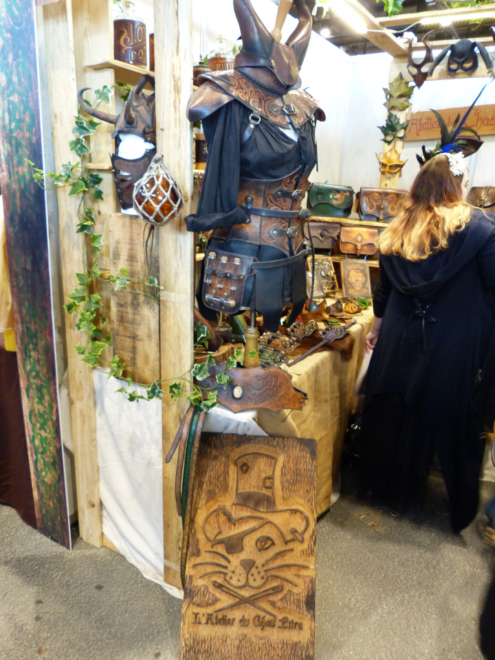 Ce salon était exceptionnel, comme d’habitude. La décoration des stands est toujours aussi soignée, les vendeurs jouent le jeu en se costumant, l’ambiance est excellente et il règne un côté bienveillant très agréable. La foule était juste ABOMINABLE. J’ai quand même du revenir le lendemain pour prendre plus de photos de costumes en espérant qu’il y ait moins de monde le matin. Que nenni ! De dépit, je suis passée en mode shopping (absolument pas prémédité, promis-juré !)… Bon cette fois-ci, je n’ai pas crevé mon budget. Mais va falloir que je prévois plus grand pour la prochaine fois. Pour mon futur chapeau steampunk (avec plein de plumes « fluffies » et un petit poulpe parce que j’adore les poulpes et les plumes), pour une tête de loup de Gruliette (ou d’ours, ou de dragon), pour une petite sacoche en cuir avec motif feuille… Arf, je vais louer mon chat pour me faire plus de sous… Quelqu’un en manque de calin serait prêt à louer mon chat ? Il fait très bien la conversation aussi. Du moment que vous lui répondez, il ne s’arrêtera pas de miauler…