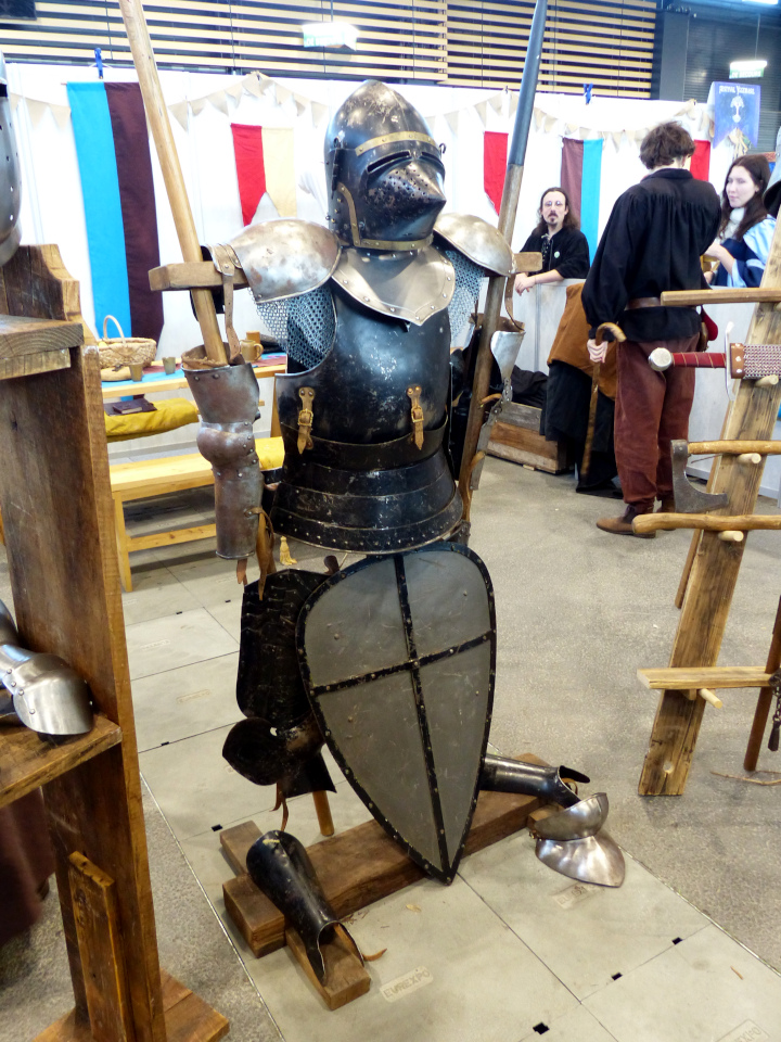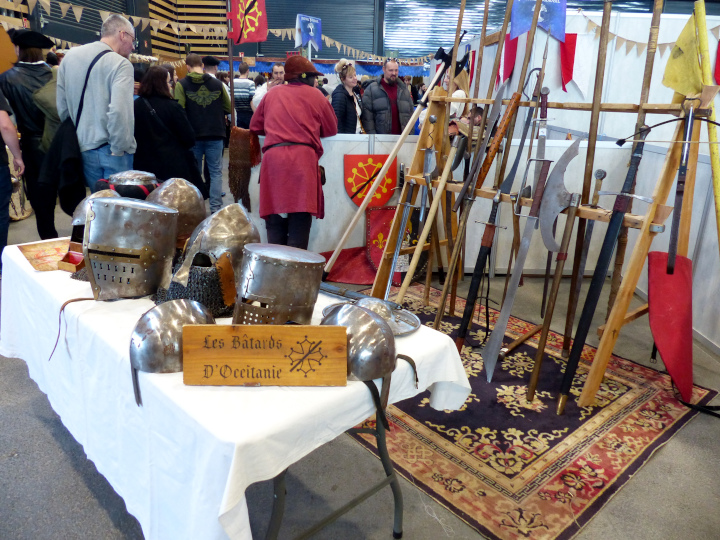L’entrée se faisait au niveau de Kamelot, l’univers médiéval. Et pour vous mettre dans l’ambiance, le premier stand était celui des Batards d’Occitanie. Ces derniers avaient mis leur équipement à disposition, si jamais vous vouliez soupeser le poids d’un gant. Vous pouviez même essayer la tenue. Avec un peu d’aide parce que c’est lourd et encombrant. Ils ont fait une belle démonstration de combat. Et le bruit des armes contre les armures est assez impressionnant. J’ai aussi assisté au deuxième combat d’une jeune femme qui pesait 50kg alors que son armure faisait entre 20 et 30kg. Avec juste quelques petits trous pour respirer dans le casque. Je ne l’enviais pas du tout ! Il faisait déjà chaud dans le salon alors sous tout ce poids à se prendre des coups et à en donner, ça devait être la fournaise.
