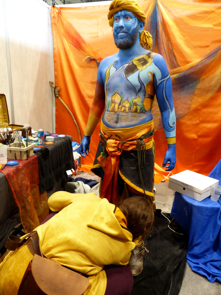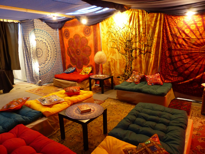 Le nouvel espace Agraah-ba était le paradis du body painting avec plusieurs artistes à l’œuvre. Mais la décoration de ce nouvel espace valait le coup à elle seule ! Avec de beaux tapis partout et des drapés au dessus de nos têtes pour nous mettre dans l’ambiance des 1001 nuits. Ou d’Aladin, si vous préférez. Une diseuse de bonne-aventure était à votre disposition ainsi qu’une conteuse pour vous faire un peu plus voyager…