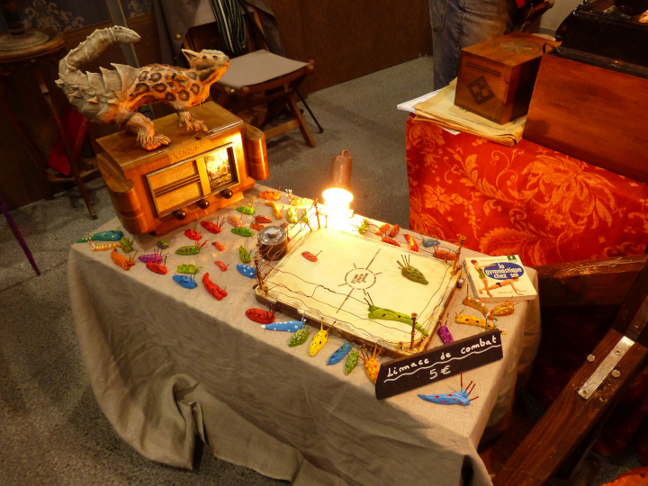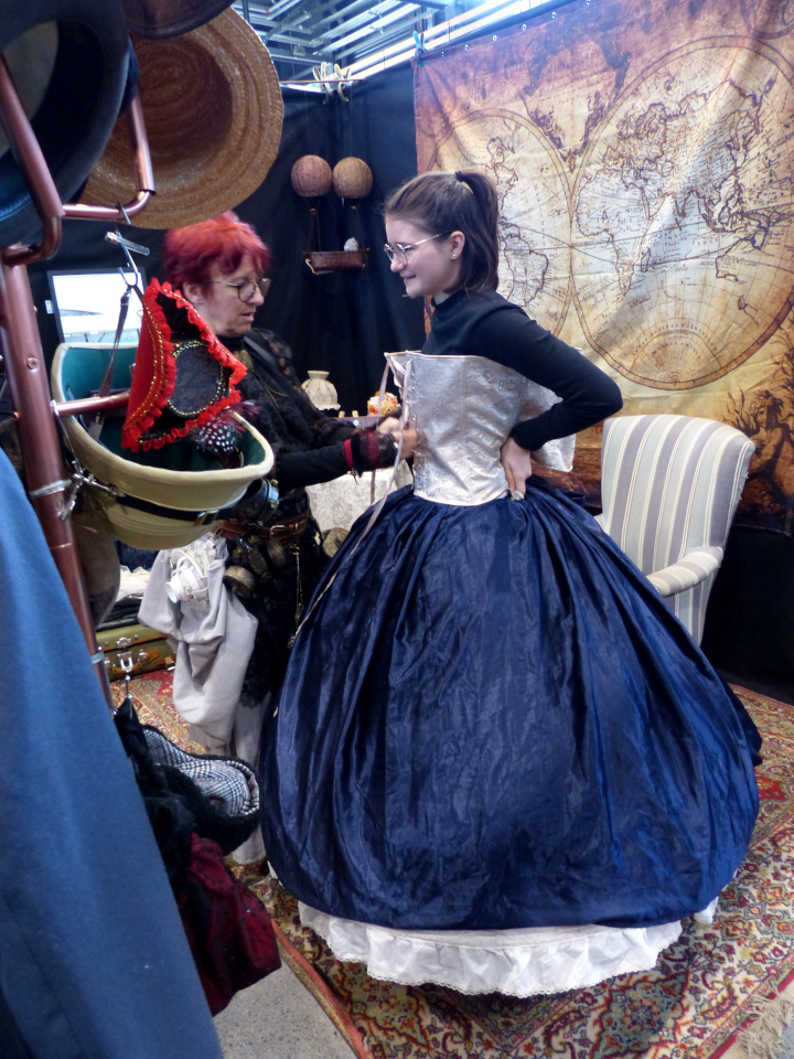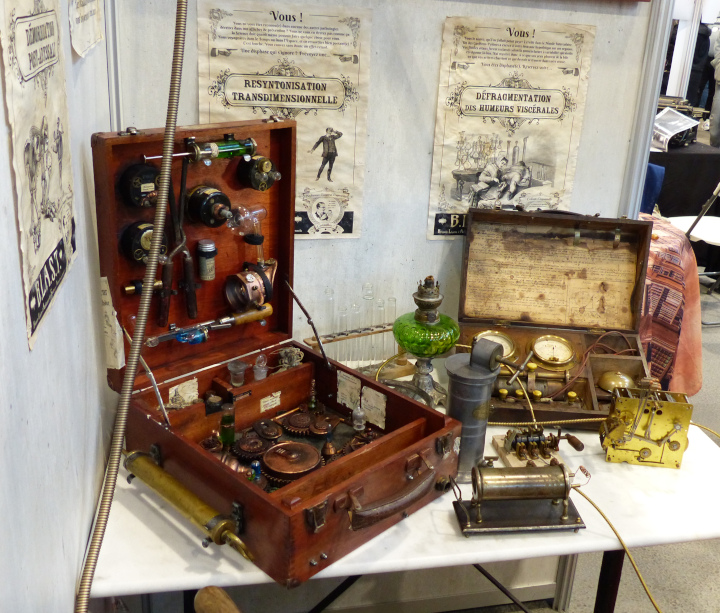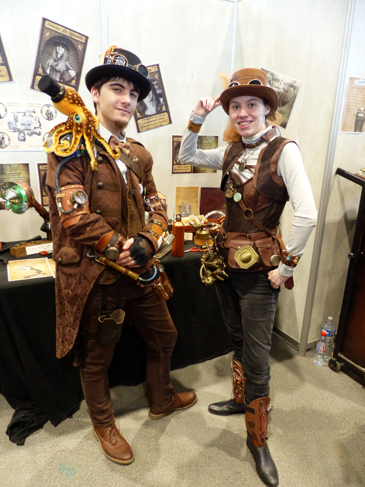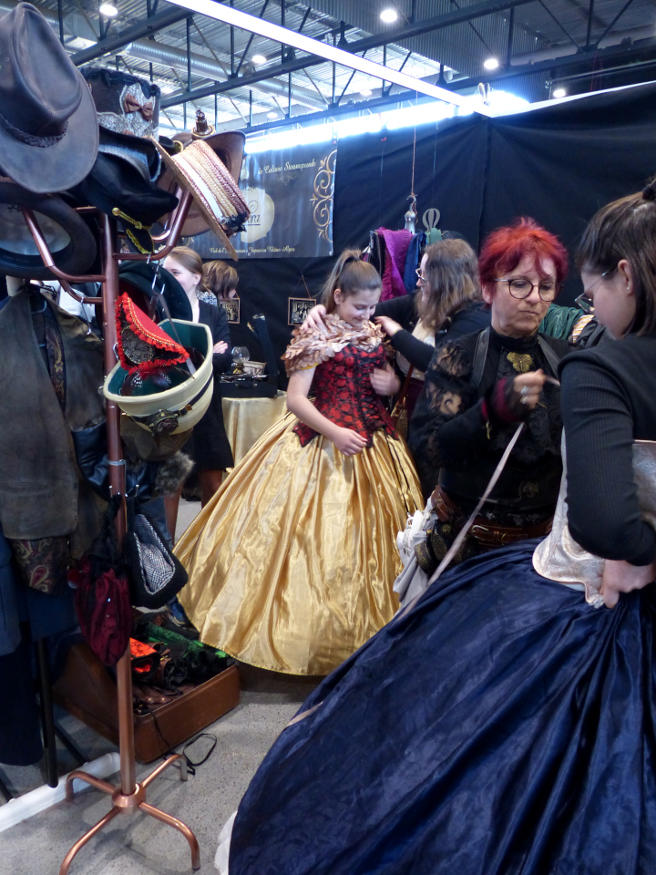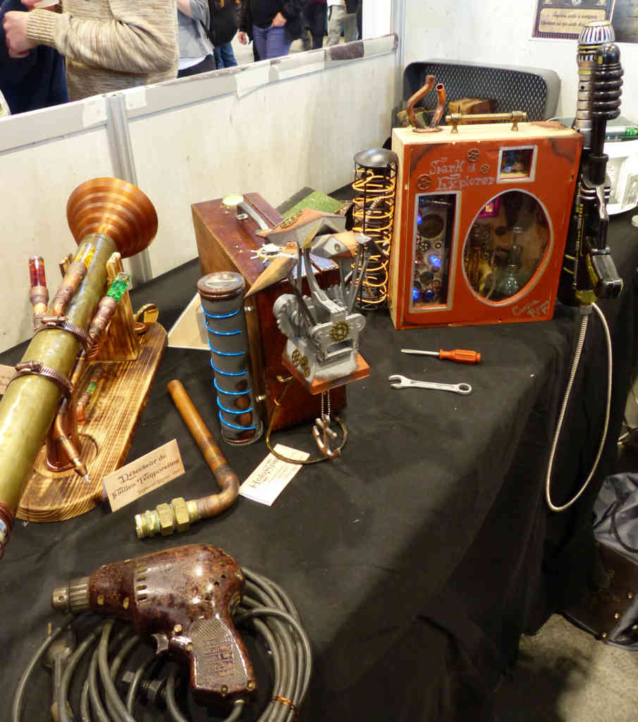 Maintenant, mon espace préféré : celui du steampunk qui n’a jamais assez de stands (avis personnel, bien sûr). Et pourtant, cette fois-ci il y en avait plus que d’habitude ! Comme toujours l’association CLIVRA faisait découvrir l’univers en faisant essayer des tenues ou en proposant un duel de thé. Mais ce n’était pas les seuls qui faisaient découvrir le monde Steampunk. D’autres présentaient des machines, des œuvres ou tout simplement un peu de l’univers.