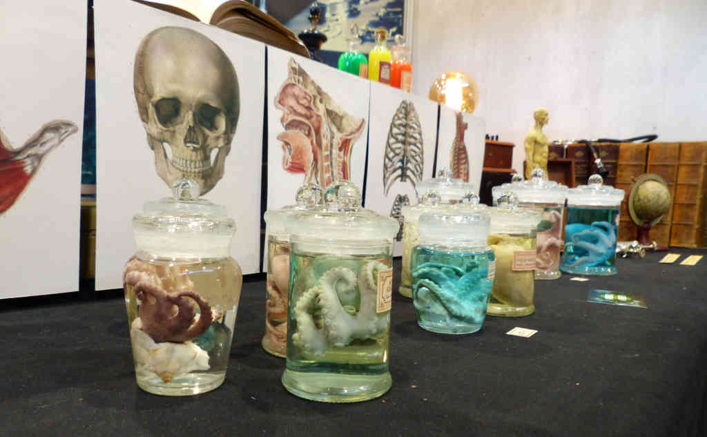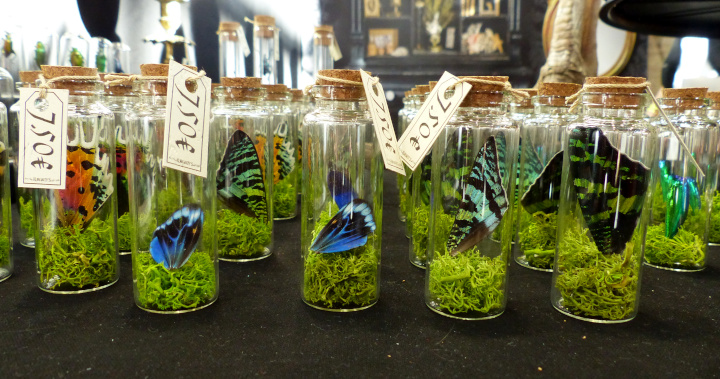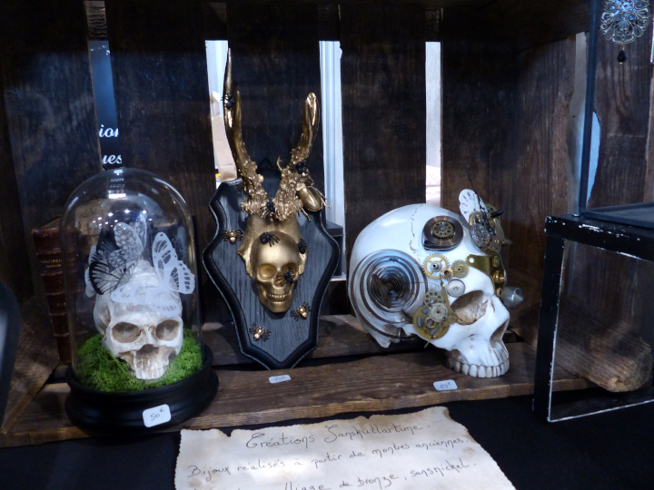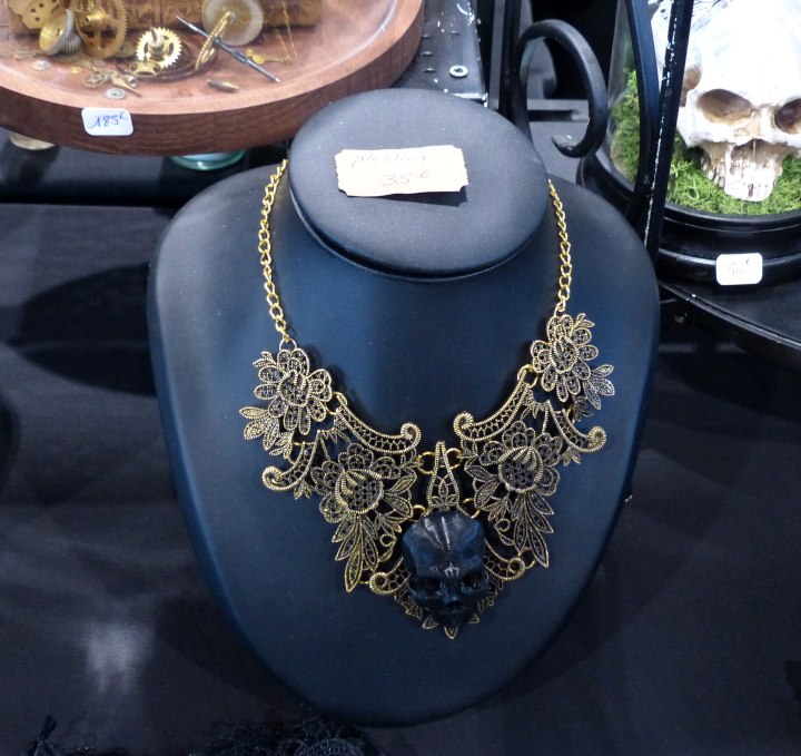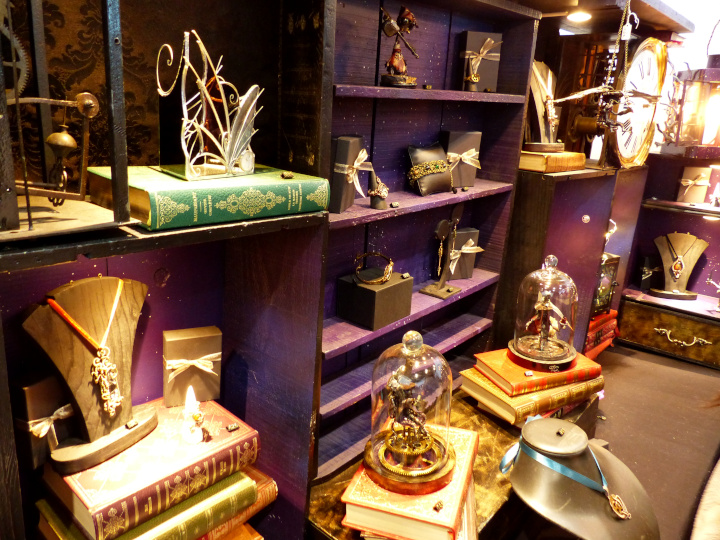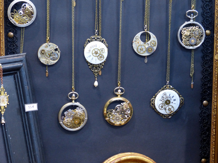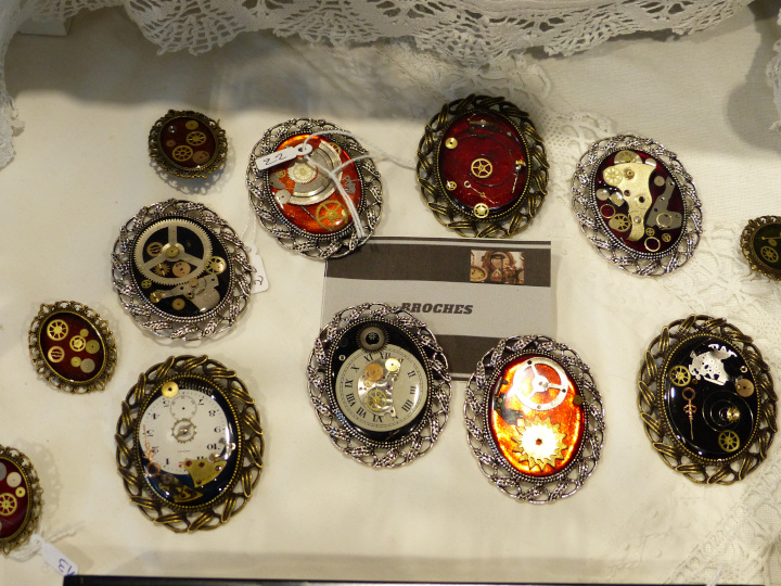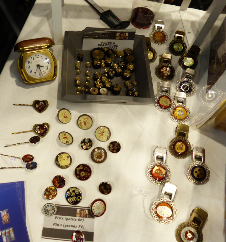 Je me suis acheté un joli petit collier chez VPB Bijoux Steampunk fait à partir de montres anciennes. Mon collier a des origines anglaises et japonaises notamment. Et petit plus, si jamais je le casse, il suffit de contacter la venduse par mail. Les réparations sont gratuites. Je regrette juste de ne pas avoir tout de suite craqué sur un des petits flacons colorés contenant un petit poulpe de Produits [d] Rivets. Quand je suis repassée le lendemain, il n’y avait plus les bleus… Ils étaient tellement mignons…