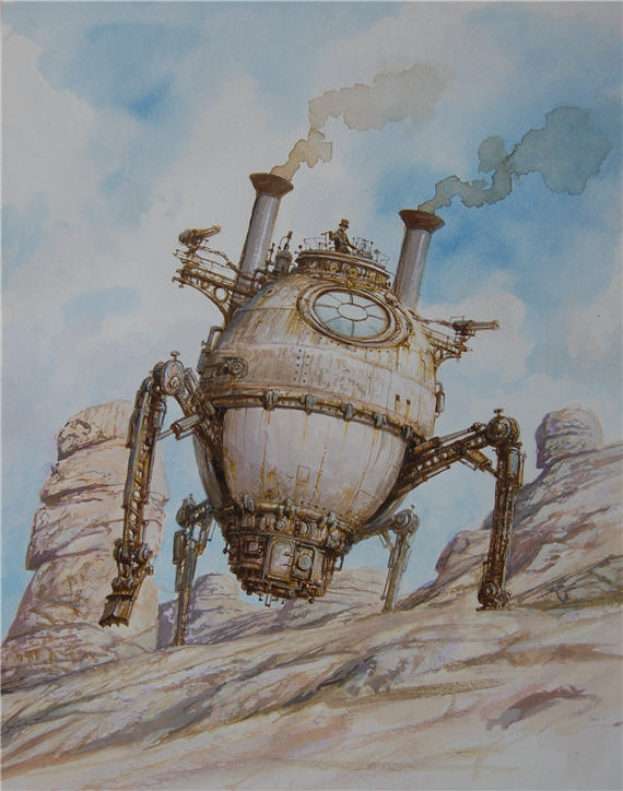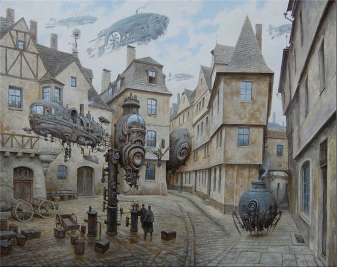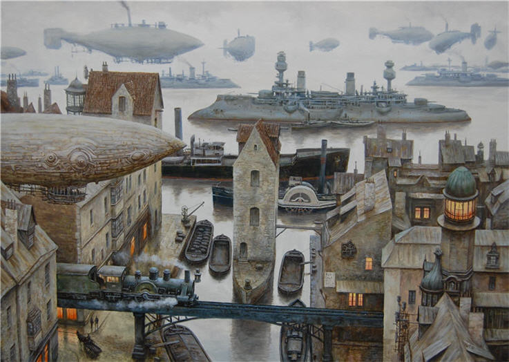 Si le Steampunk possède ses illustrateurs ou dessinateurs, Vadim Voitekhovitch quant à lui s’impose comme le peintre du genre. Ses peintures s’imposent comme des œuvres véritablement imprégnées par l’ère victorienne, mais aussi par ce qui caractérise le mieux le genre à savoir les machines à mécanisme alimentées à la vapeur. Peu connaissent encore en France le travail de ce peintre biélorusse installé depuis 2004 en Allemagne. Ses thèmes de prédilections ? Les villes et notamment les espaces laissés libres en leur sein, places, ports, larges rues…