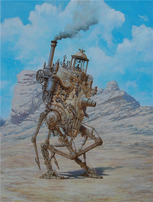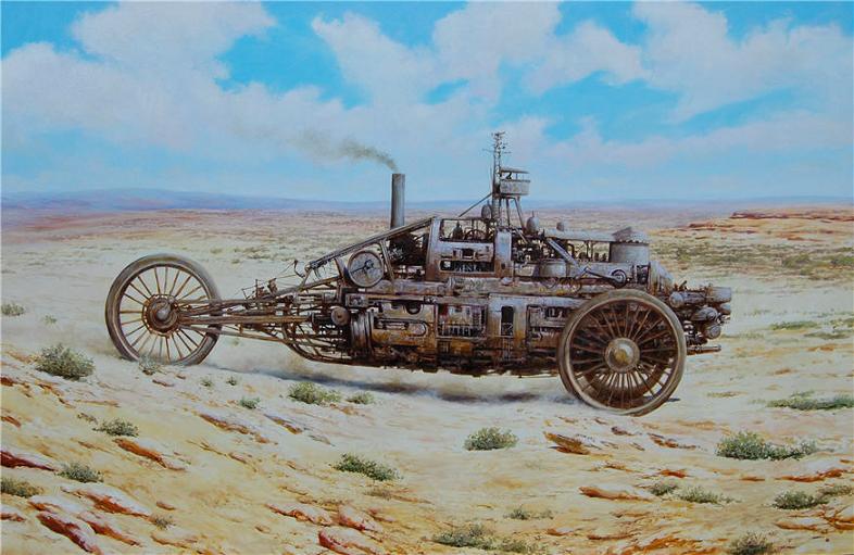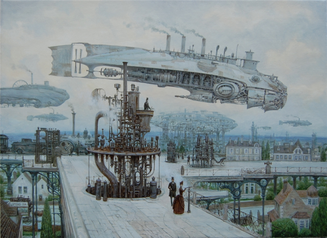 Si le Steampunk possède ses illustrateurs ou dessinateurs, Vadim Voitekhovitch quant à lui s’impose comme le peintre du genre. Ses peintures s’imposent comme des œuvres véritablement imprégnées par l’ère victorienne, mais aussi par ce qui caractérise le mieux le genre à savoir les machines à mécanisme alimentées à la vapeur. Peu connaissent encore en France le travail de ce peintre biélorusse installé depuis 2004 en Allemagne. Ses thèmes de prédilections ? Les villes et notamment les espaces laissés libres en leur sein, places, ports, larges rues…