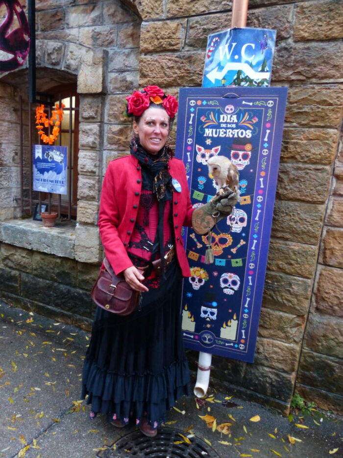 Au fil des ruelles, vous pouviez rencontrer une fauconnière qui promenait sa petite chouette toute mignonne. On pouvait voir plus d’oiseaux de nuit dans une des alcôves mais ils ont eu beaucoup de succès et je n’ai pas pu m’approcher tellement il y avait de monde. Dans une autre alcôve au fond d’une des ruelles avait lieu le deuxième numéro de feu. Ce numéro aussi a attiré beaucoup de monde et du coup il était difficile de voir quelque chose au début. Mais comme le spectacle était assez long et que la fermeture approchait, les gens ne restaient pas jusqu’au bout et j’ai pu assister à la fin. Ce qui était très amusant et très efficace, c’est qu’avant le début de leur spectacle, ils ont fait un appel dans toutes les allées pour rameuter du monde. Et c’était très drôle de voir la foule qui suivait le meneur (suivi de près par un pompier et son extincteur).