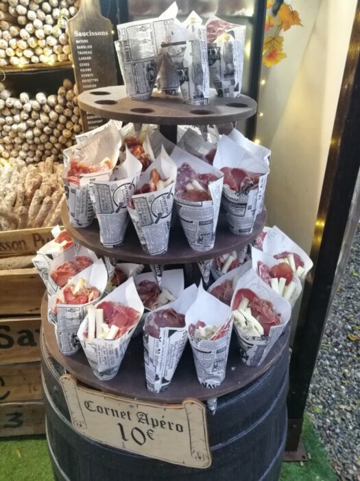 Il y avait aussi de quoi se sustenter. Certains sont des habitués comme les vendeurs de charcuterie et de fromages. Ils étaient d’ailleurs ravis de nous annoncer qu’ils faisaient maintenant de la vente en ligne sur notre-terroir.fr. Et oui, j’ai pris des saucissons, j’aime particulièrement celui au poivre et j’ai découvert celui au canard. Ils ont eu la bonne idée de faire des cornets apéro en plus cette année ! Autre nouveauté, on avait la flammekueche de disponible ! Et je peux vous dire qu’elle était bonne ! Et chargée en oignons comme je les aime.