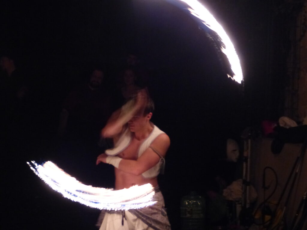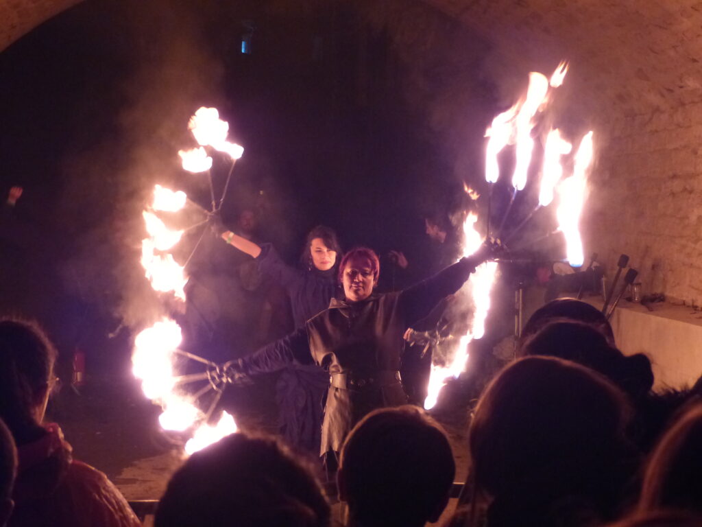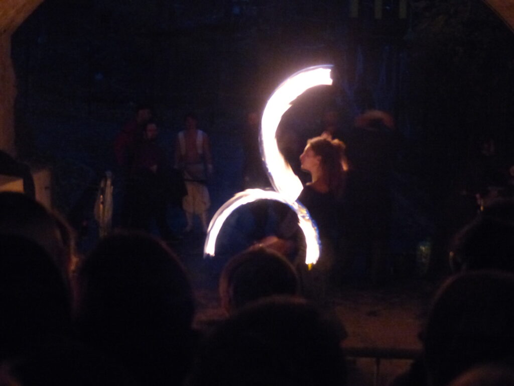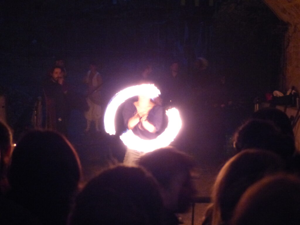 Au fil des ruelles, vous pouviez rencontrer une fauconnière qui promenait sa petite chouette toute mignonne. On pouvait voir plus d’oiseaux de nuit dans une des alcôves mais ils ont eu beaucoup de succès et je n’ai pas pu m’approcher tellement il y avait de monde. Dans une autre alcôve au fond d’une des ruelles avait lieu le deuxième numéro de feu. Ce numéro aussi a attiré beaucoup de monde et du coup il était difficile de voir quelque chose au début. Mais comme le spectacle était assez long et que la fermeture approchait, les gens ne restaient pas jusqu’au bout et j’ai pu assister à la fin. Ce qui était très amusant et très efficace, c’est qu’avant le début de leur spectacle, ils ont fait un appel dans toutes les allées pour rameuter du monde. Et c’était très drôle de voir la foule qui suivait le meneur (suivi de près par un pompier et son extincteur).