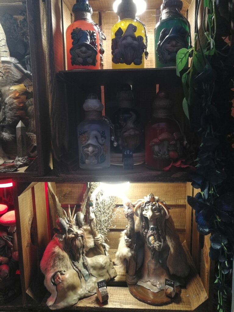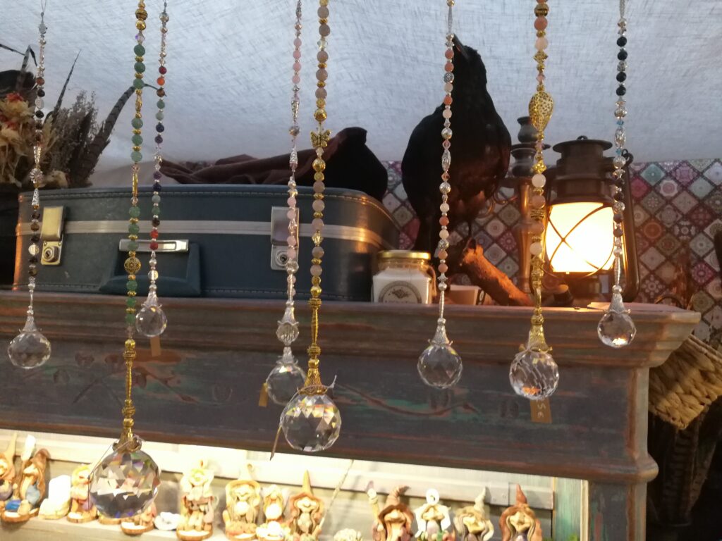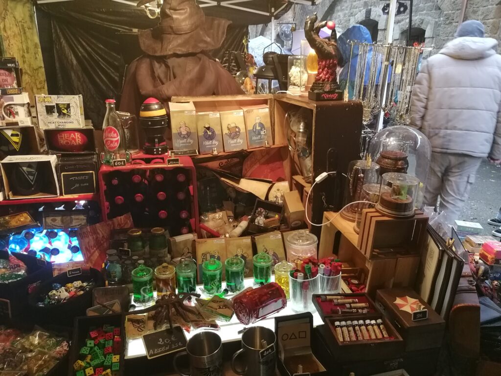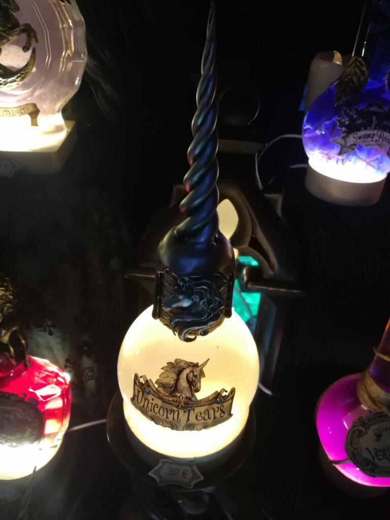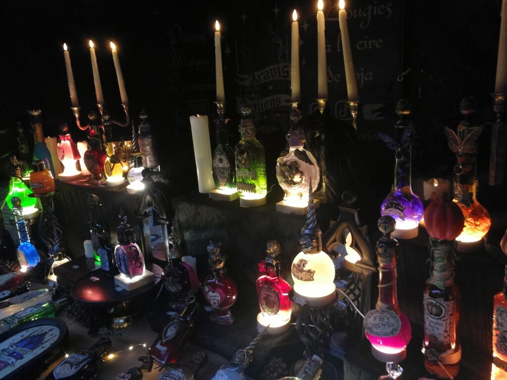 Comme l’année dernière, le créneau est trop court pour pouvoir tout faire. La fois précédente, on avait eu les yeux plus gros que le ventre. On ne voulait rien rater : stands, animations, ateliers. Mais au final, nous n’avions pu faire que deux allées sur trois. Cette fois-ci, nous avons fait tous les stands, mais nous n’avons pu assister qu’à 2-3 animations et nous n’avons fait qu’un seul atelier, celui des potions. Et de toutes façons, la plupart des animations attiraient la foule. Nous sommes passés plusieurs fois devant celui des potions et à chaque fois il y avait une file d’attente. Nous avons pu faire le dernier créneau. Nous n’avons pas pu entrer non plus aux stands des épices extra-terrestres et sa marchande que j’avais adorée l’année dernière.