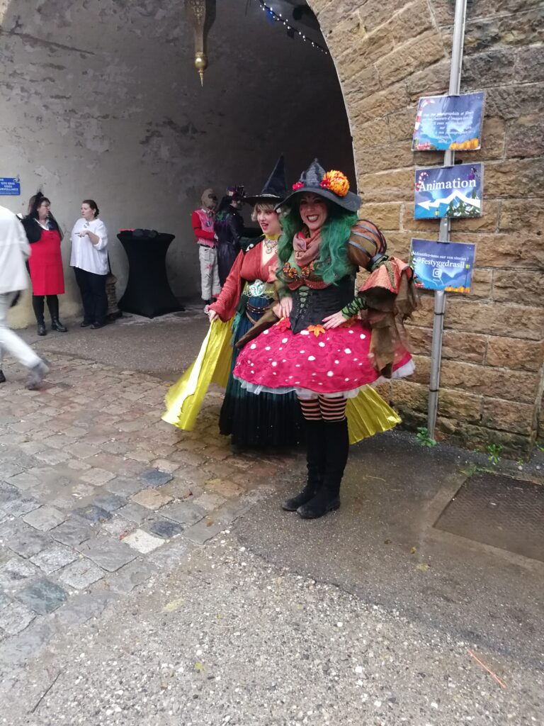 J’aime spécialement la nocturne, il fait encore jour et la nuit nous tombe dessus. L’atmosphère est complètement différente, la nuit colle parfaitement au thème. Les décorations lumineuses donnent ce petit air magique et pour moi, il ne manquait que quelques torches pour parfaire l’ambiance. Mais ça ne colle pas trop avec la sécurité et du coup il m’a fallu me contenter du spectacle de feu. Même si je n’en ai vu qu’un seul sur les deux. Et puis de toutes façons, il a plu pratiquement tout du long donc les torches n’auraient pas tenues. Il y avait aussi malheureusement peu de costumes, probablement du à la pluie. Mais quelques uns ont quand même tenté le coup et il y avait toujours la troupe d’Yggdrasil, au taquet au niveau costumes, décors et surtout ambiance ! Ils ont tous une énergie incroyable.