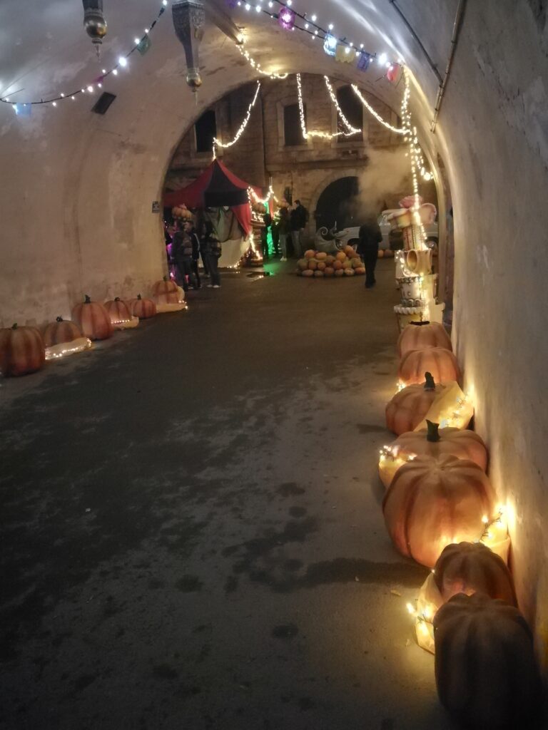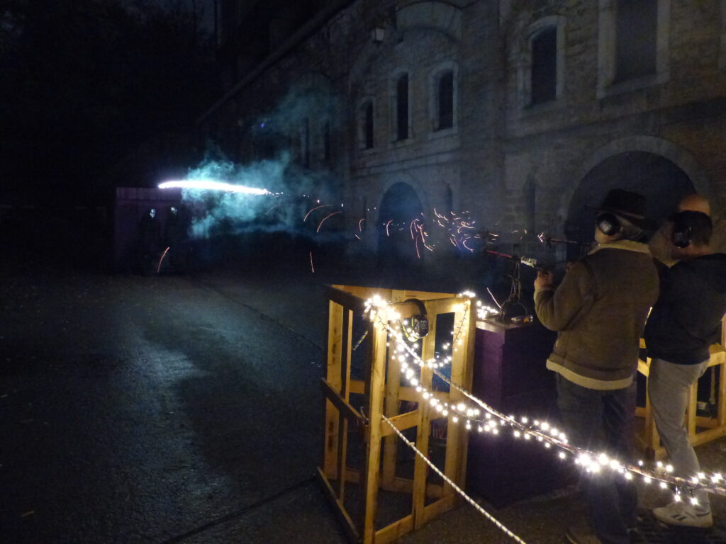 L’Etrange Noël des Sorciers se déroule au Fort de Bron qui est constitué de 3 allées, deux latérales et une centrale. Cette dernière est en fait un tunnel nous amenant à une petite place. Et c’est là qu’on pouvait trouver la Vogue aux Citrouilles. On pouvait y voir plusieurs stands de fête foraine mais gratuits et tenus par des personnages… originaux. La bonne nouvelle est que le Docteur Vaudou et son frère empaillé tenaient des stands et faisaient une belle animation. La mauvaise nouvelle est que du coup, ils n’avaient pas leur salle où ils pouvaient pratiquer leur « art » et c’est bien dommage parce que leur numéro était très amusant. Mais ils étaient dans leur élément à la vogue. Parmi les citrouilles, il y avait aussi un spectacle d’artistes du feu que nous avons malheureusement raté. Par contre, il y avait le stand de Pétaradabra où « vos amis n’en reviendront pas ! ». A prendre au sens propre comme au figuré… C’était un stand de tir contre les Mange-morts. Stand qui a eu particulièrement de succès auprès des adultes !