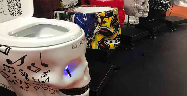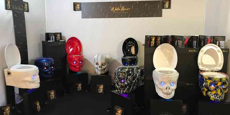 Aujourd’hui je vous présente donc des toilettes en forme de crâne. Avec des petites lumières dans les yeux. Et vous pouvez choisir le motif et la couleur. Et elles ont aussi des enceintes bluetooth. Et je veux les mêmes chez moi…