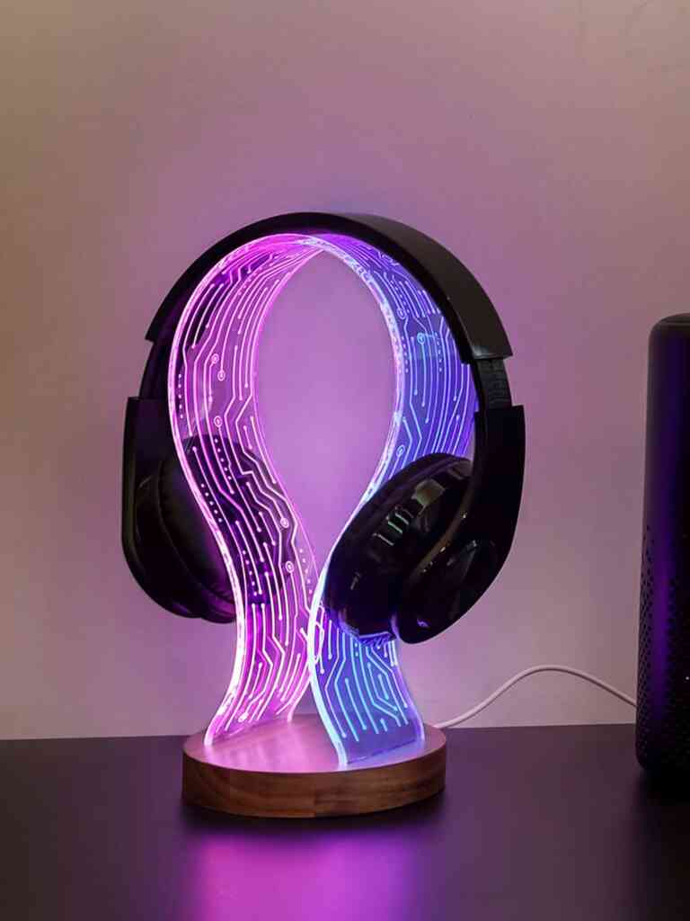 Pour les gamers et amateurs de musique, je vous propose un beau support pour votre casque audio. Bien sûr, il vous faut aimer le style cyberpunk et les choses qui apportent encore un peu plus de lumière chez vous.