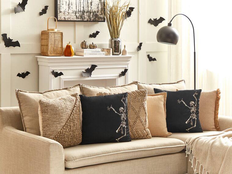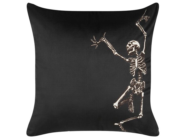 Il n’y a rien de mieux pour célébrer l’esprit de Noël qu’un petit motif de… squelette ! Et vous le trouverez sur ce joli coussin en velours noir.