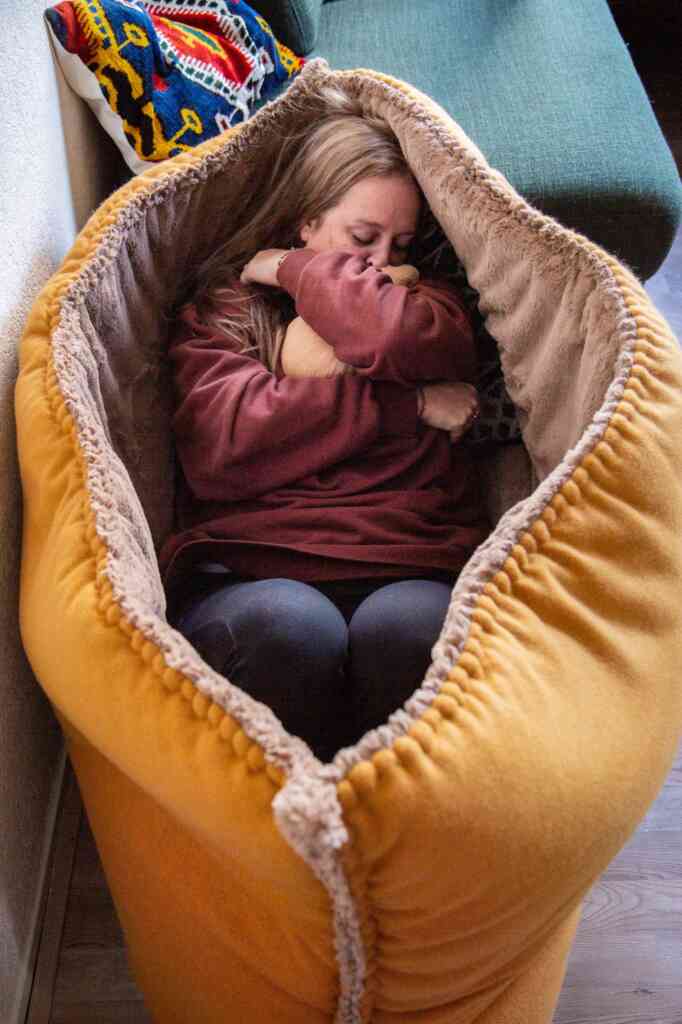 Mais revenons à notre Floof. Cette sorte de poche géante en moumoute pour se cacher et/ou se mettre au chaud. L’idée me plait beaucoup. Je ne suis pas sûre que la position pour lire soit super confortable, mais pour se rouler en boule dans les situations de désespoir, ça doit le faire ! Peut être utile aussi pour (piéger) votre enfant, ou comme lit cachette pour votre chat ?