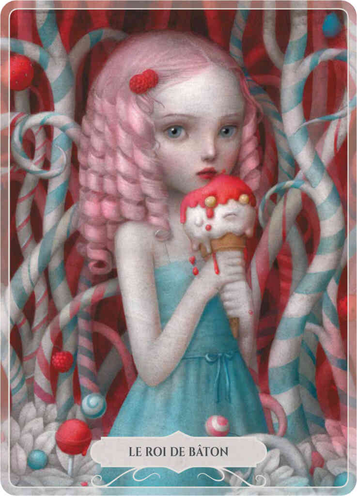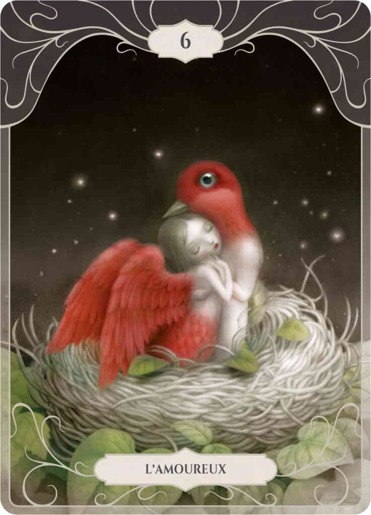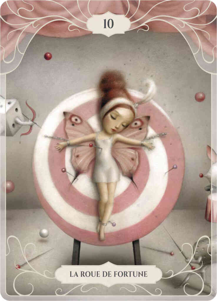En 2010, j’évoquais déjà le travail de Nicoletta Ceccoli dans cet article, puis en 2013 dans celui-ci. Et il y a tout juste 13 ans, alors que je travaillais à la rédaction de mon article de la Sélection MaXoël, je parlais du travail de Nicoletta Ceccoli sur Beautiful Nightmares (Soleil Productions) et j’écrivais alors cela : « Le monde de Nicoletta Ceccoli peut être considéré comme une relecture (ou une extension) de mondes tout aussi interrogatifs et ténébreux que ceux d’un Lewis Carroll ou d’un Tim Burton, les deux références qui viennent tout de suite à l’esprit lorsque l’on parcourt le sien. Mais l’univers de l’artiste italienne possède sa propre trame, son propre bestiaire, son propre no man’s land gris et incertain (…) on ressent une solitude touchante, une mélancolie que relève fort heureusement une grande ouverture d’esprit fait d’un foisonnement d’imaginaires parfois déconcertants : monstres hybrides, animaux ou insectes protéiformes, contextes pluriels… ». Je crois que la singularité de l’œuvre de l’artiste italienne, tient en cela. Elle suggère beaucoup, apporte avec elle, dans ses illustrations, les rêves et les cauchemars qui l’envahissent parfois, et qu’elle nous offre en lecture. Pour son travail sur le Tarot de Marseille, elle revient à ses thèmes de prédilection : la jeune fille fragile qui s’éveille à la vie, peut-être trop rapidement, et à qui échappent encore des bribes de réel. Mais la jeune femme devenue peut aussi s’affirmer, devenir maîtresse de son destin, s’affranchir des peurs et des démons passés, pour s’épanouir dans son présent et dans le futur. Un futur qui pourrait bien se déterminer par des lames tirées…