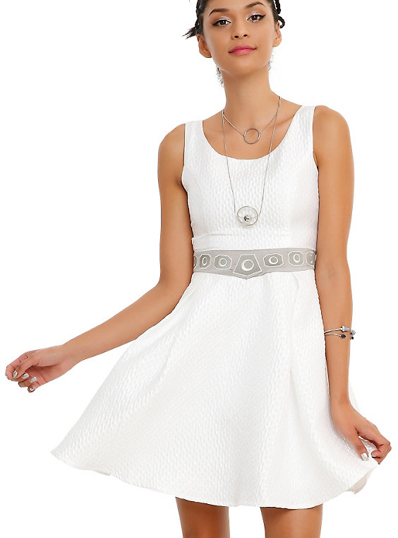 La robe Jedi à gauche, la robe Princess Leia au milieu (un peu plus discrète) et la robe Stormtrooper à droite.
