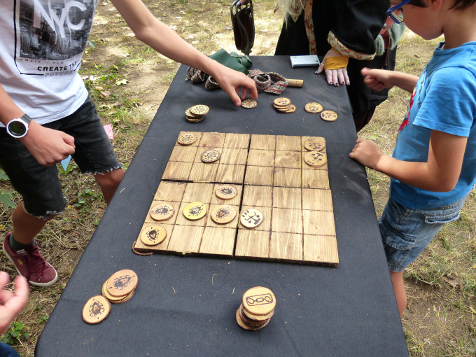 Les enfants étaient bien servis aussi. Le passeport leur donnait accès à certains ateliers qui n’intéressaient pas les adultes. Par exemple l’atelier des sorcières où ils devaient chercher dans un chaudron rempli de je-ne-sais-plus-trop-quoi et des cristaux pour que la sorcière puisse faire sa potion. Ou les jeux présentés par l’association Debilum Sanctum. Il y avait le lancé de chaussettes, une variante de puissance 4 et des jeux qui n’ont pas de nom et qui prendraient trop de temps à expliquer. Mais je vais quand même essayer pour l’un d’entre eux : vous avez une grille au sol, le « maître du jeu » a une carte représentant cette grille et des croix traçant un chemin. Vous devez trouver le chemin de ces croix en sautant dans les cases. Si vous vous trompez, le « maître du jeu » souffle dans son cor et vous recommencez à zéro jusqu’à ce que vous trouviez le chemin. C’est beaucoup moins drôle quand c’est expliqué, n’est-ce pas ? C’est pour ça que je n’expliquerai pas les jeux. Si vous voulez savoir, venez les voir, c’est intéressant et très amusant !